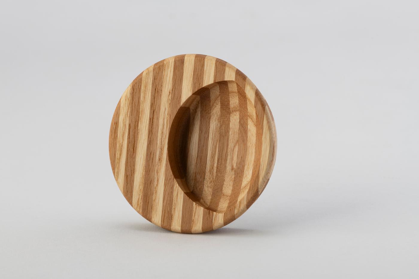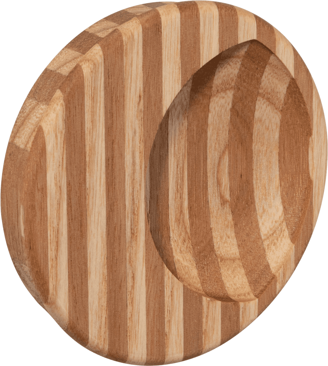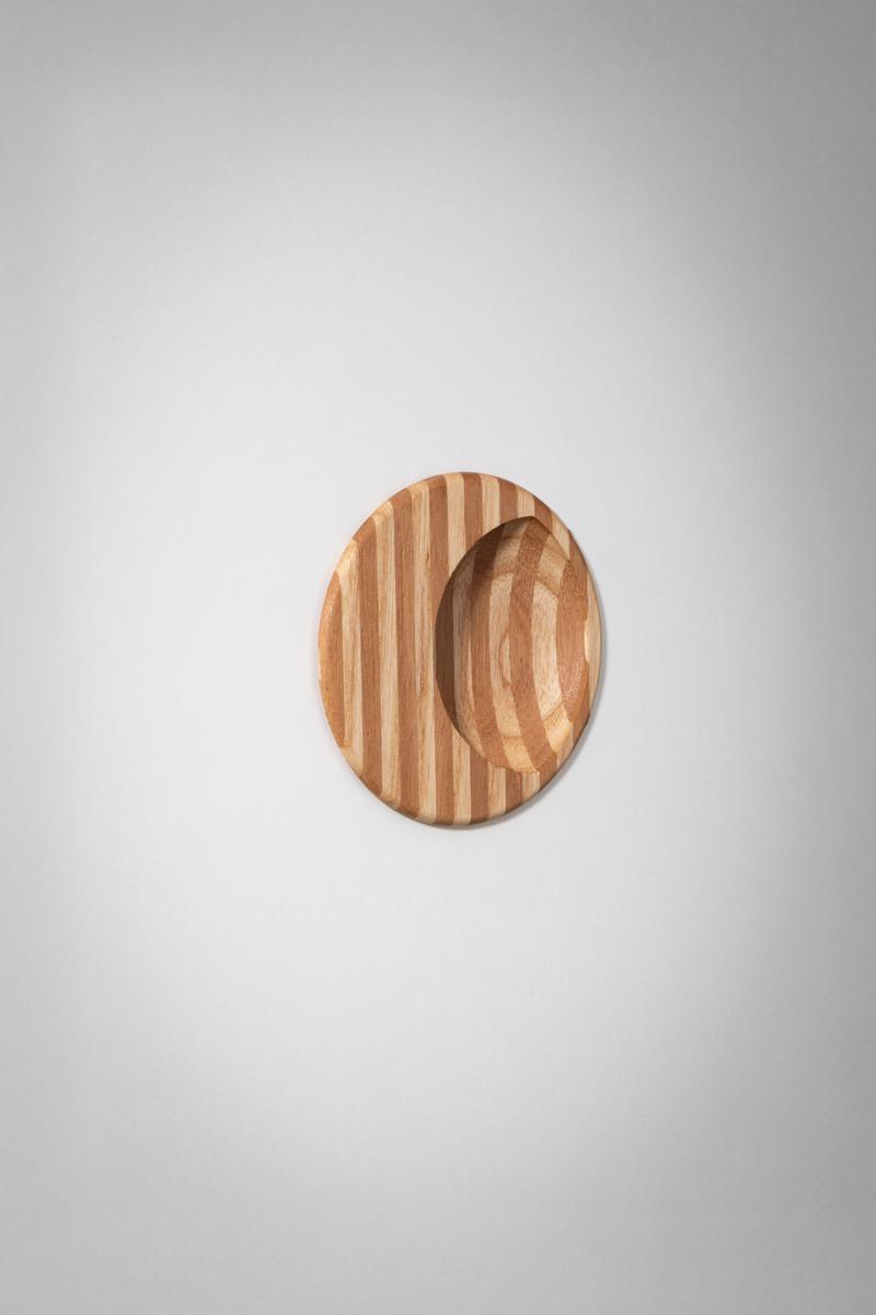 Set within a circular fixture, this sliding door pull is inset with a crescent moon, enabling fingers to snugly grasp its internal concave edge. Named after a streak of craziness, it alludes to the belief that the moon has the power to drive people to lunacy. Perfectly suited to pocket doors, it instantly animates any surface it adorns. Superbly crafted from solid timber species that span the globe, it is offered in three different striped colourways of contrasting natural tones that range in intensity from deep brown paired with blonde or an earthy red shade to more vibrant bands marrying rich aubergine and tangerine. Sold individually.
