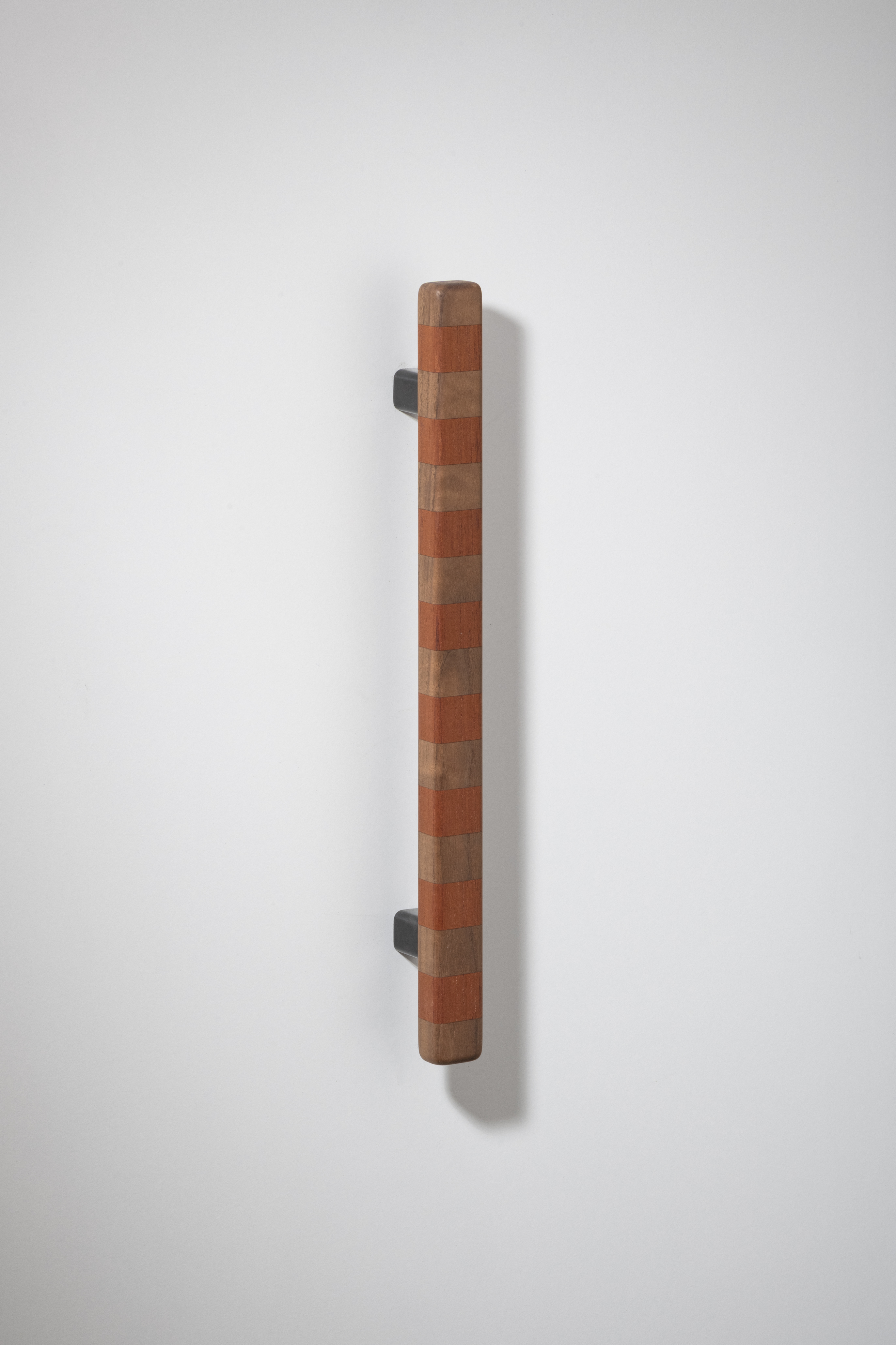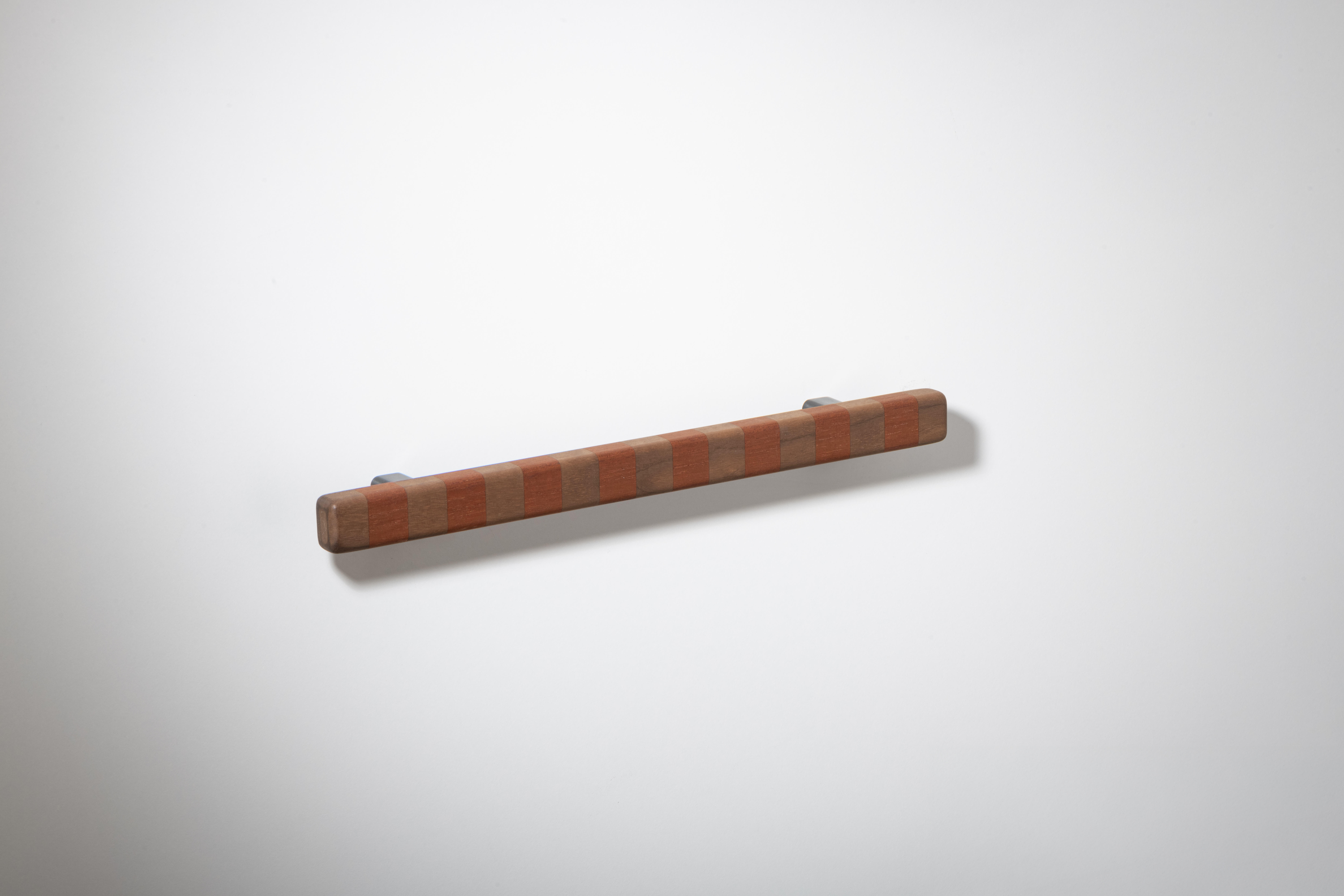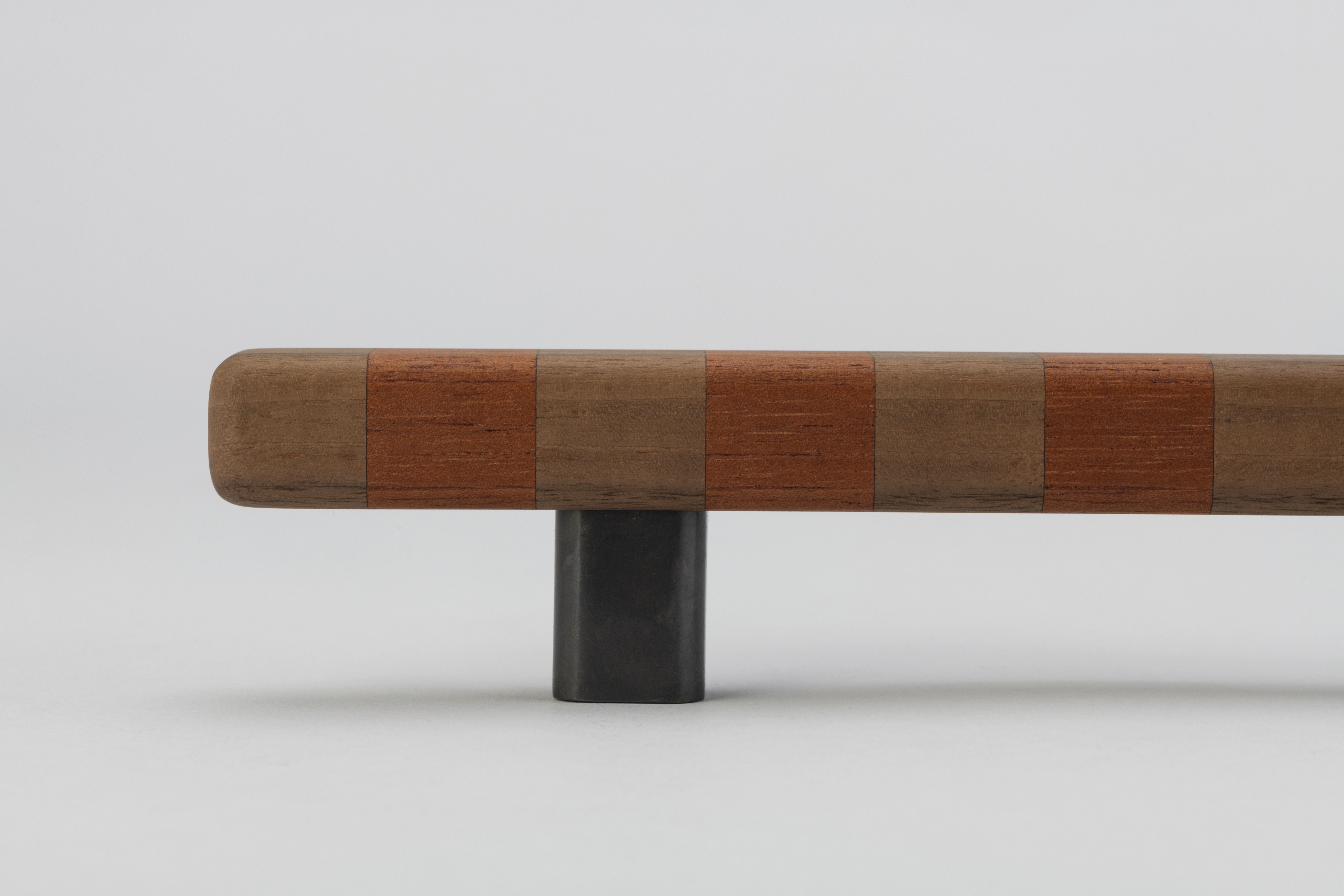 Super versatile, these flashy show ponies are named after their confident banding pattern. The solid handles are superbly hand crafted in Australia from timber species that span the globe and are offered in three striped colourways in contrasting natural tones inspired by ribbons of woodgrain. They range in intensity from deep brown paired with blonde or an earthy red shade, to more vibrant bands marrying rich aubergine and tangerine for bolder statements and will deepen tonally over time thanks to their natural oils working their magic. Offered in three sizes, they can attach to cupboard or drawer surfaces either vertically or horizontally. Smooth to the touch, they are an easy grab upon surfaces that invite constant interaction. This product features Patinated Bronze legs and comes with rear fixings.
