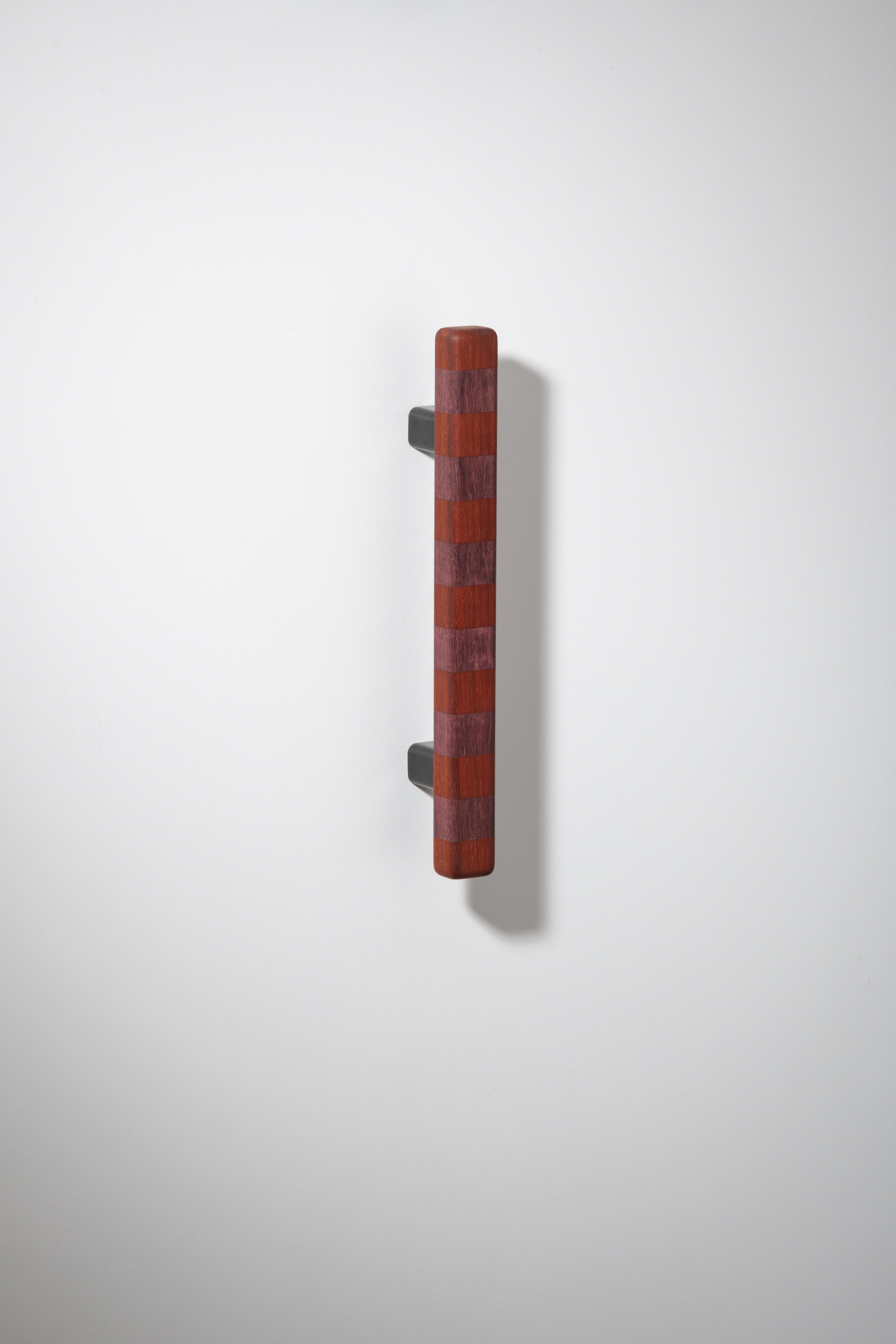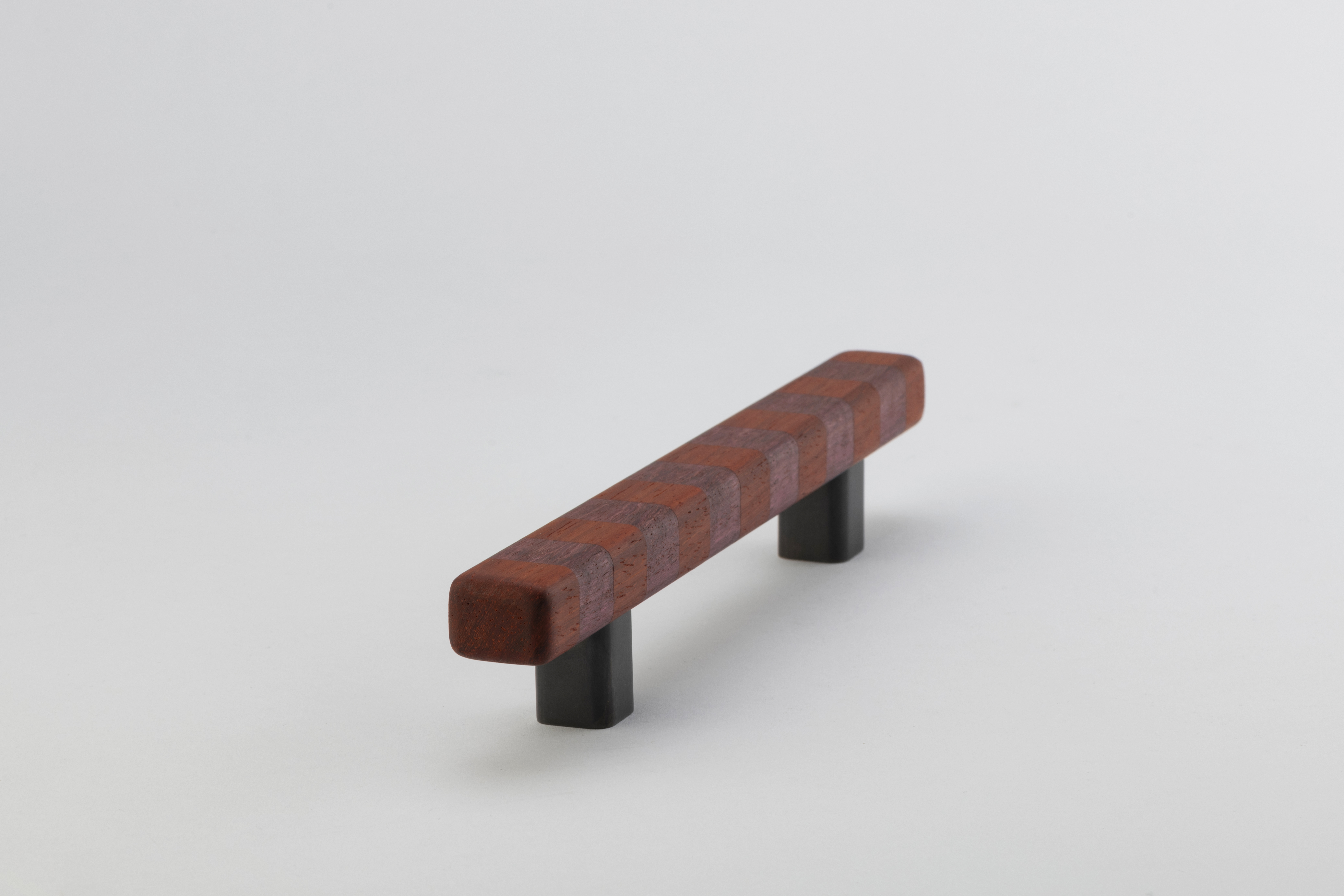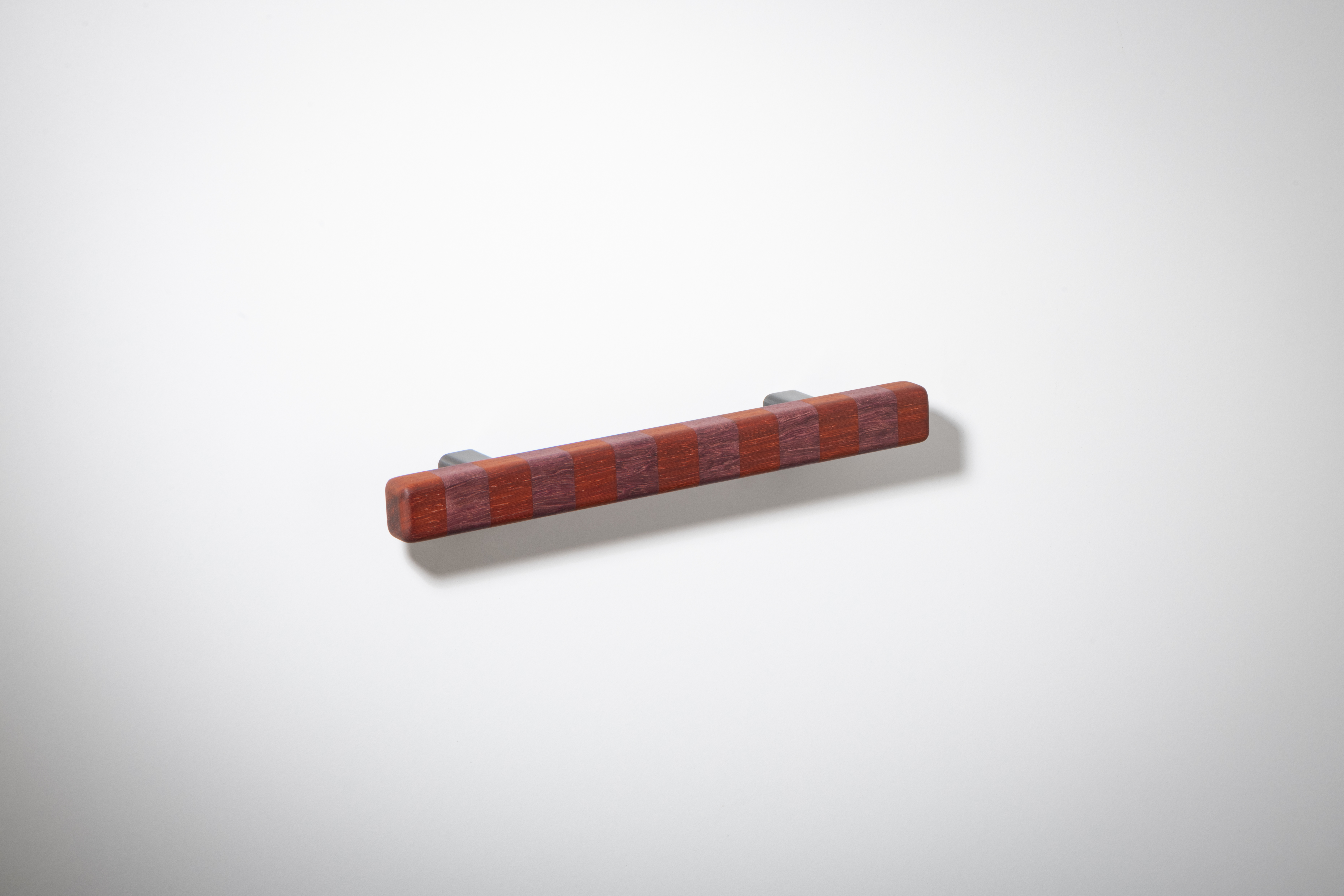 Super versatile, these flashy show ponies are named after their confident banding pattern. The solid handles are superbly hand crafted in Australia from timber species that span the globe and are offered in three striped colourways in contrasting natural tones inspired by ribbons of woodgrain. They range in intensity from deep brown paired with blonde or an earthy red shade, to more vibrant bands marrying rich aubergine and tangerine for bolder statements and will deepen tonally over time thanks to their natural oils working their magic. Offered in three sizes, they can attach to cupboard or drawer surfaces either vertically or horizontally. Smooth to the touch, they are an easy grab upon surfaces that invite constant interaction. This product features Patinated Bronze legs and comes with rear fixings.
