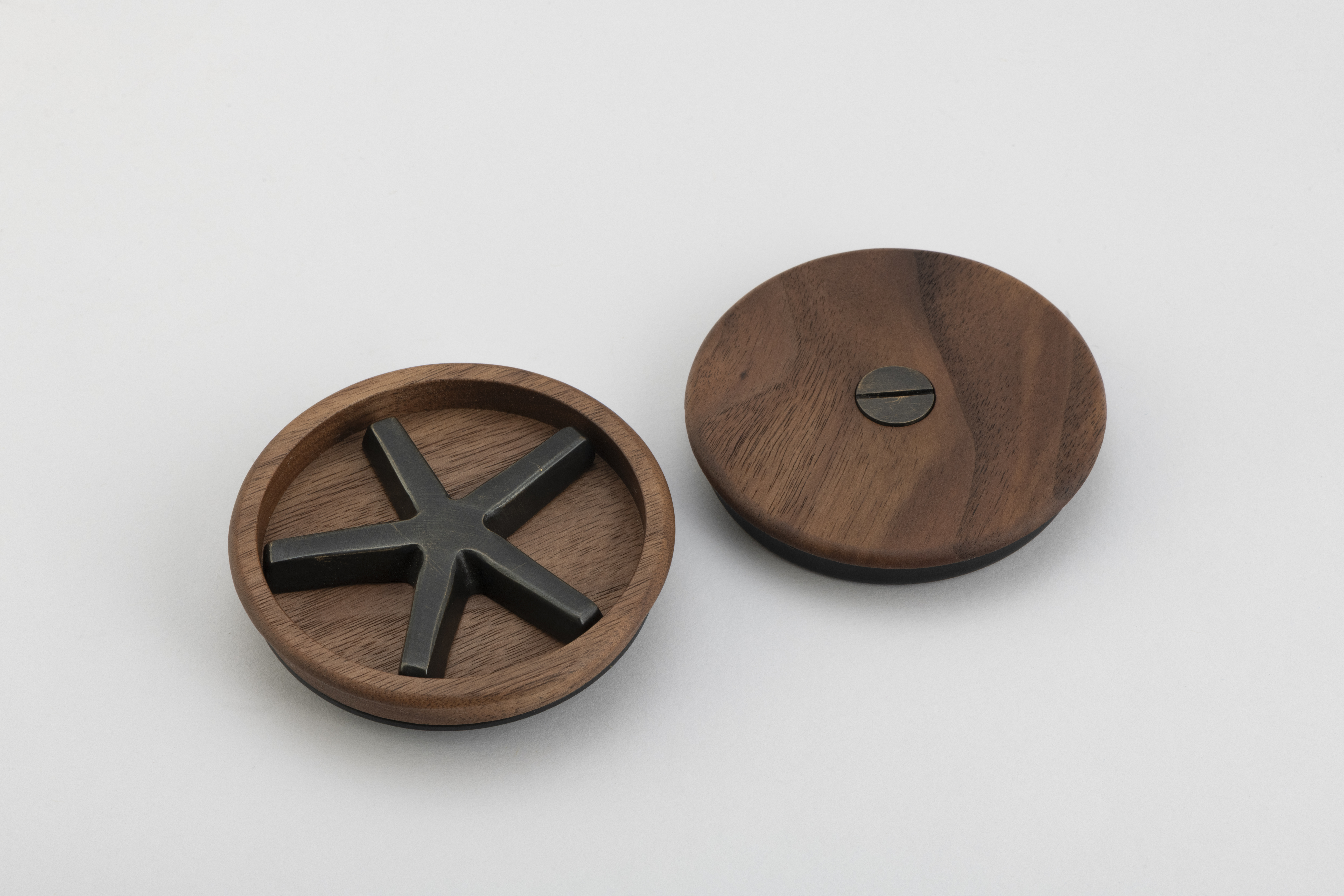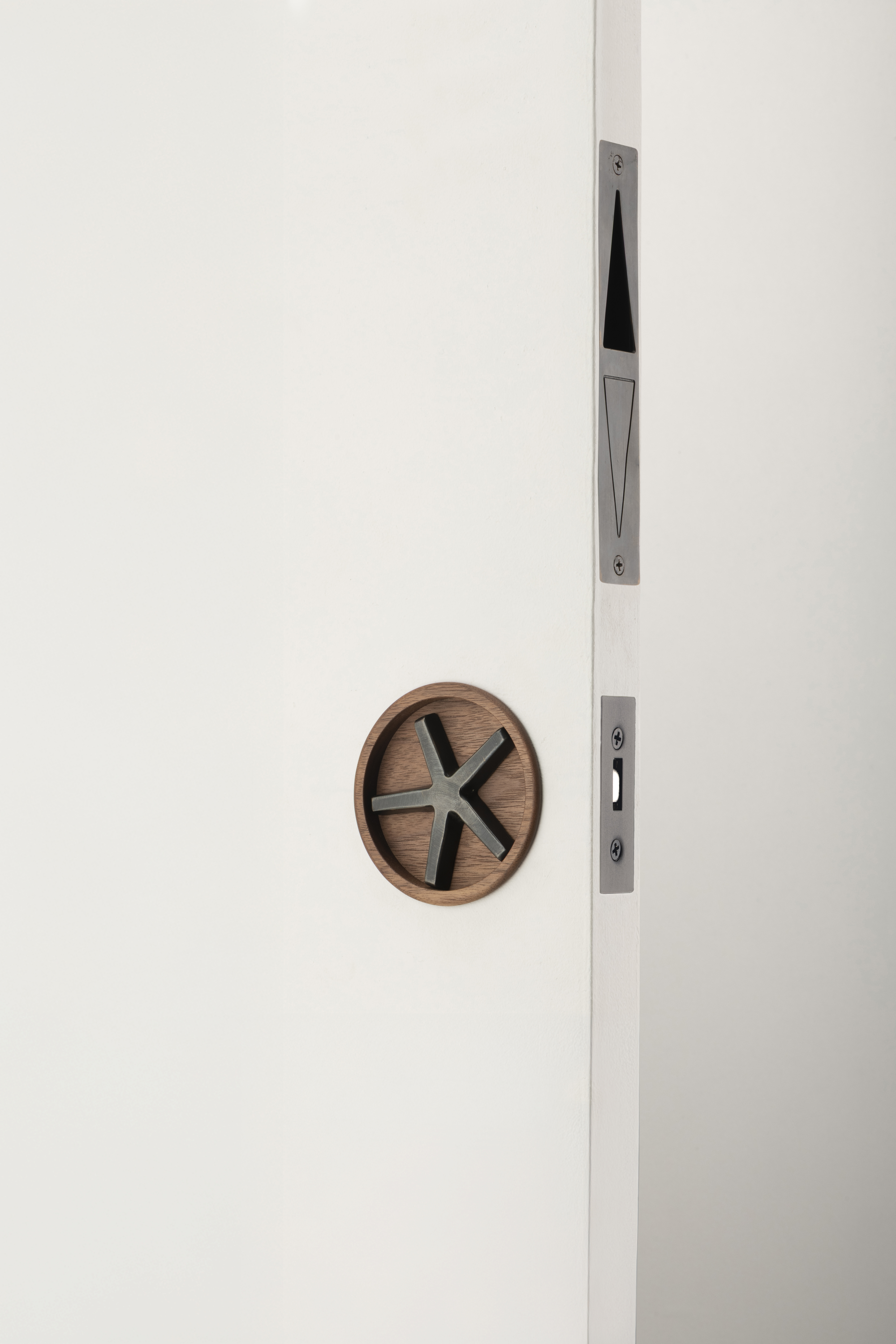 With its bold star-like expression, this sliding door privacy function captures a moment in time when it moves through space like a flash in the sky. Cast in solid bronze, it is set within three different circular timber enclosures: rich American Walnut or American White Ash timber for classic appeal, plus the vibrant tangerine shade of African Padauk for a more adventurous statement. The Flash comes with everything you need to make it work, including a matching Patinated Bronze edge pull, latch, faceplate and striker. Like a glimmering jewel that catches the eye, it sparks enquiry and invites interaction. What lies beyond the surface it adorns? While all pieces in this range are designed to mix and match, for those after lunar alignment, it pairs perfectly with the other galactic door levers and sliding door pulls. This product comes with concealed fixings and wood screws for the latch and edge pull.