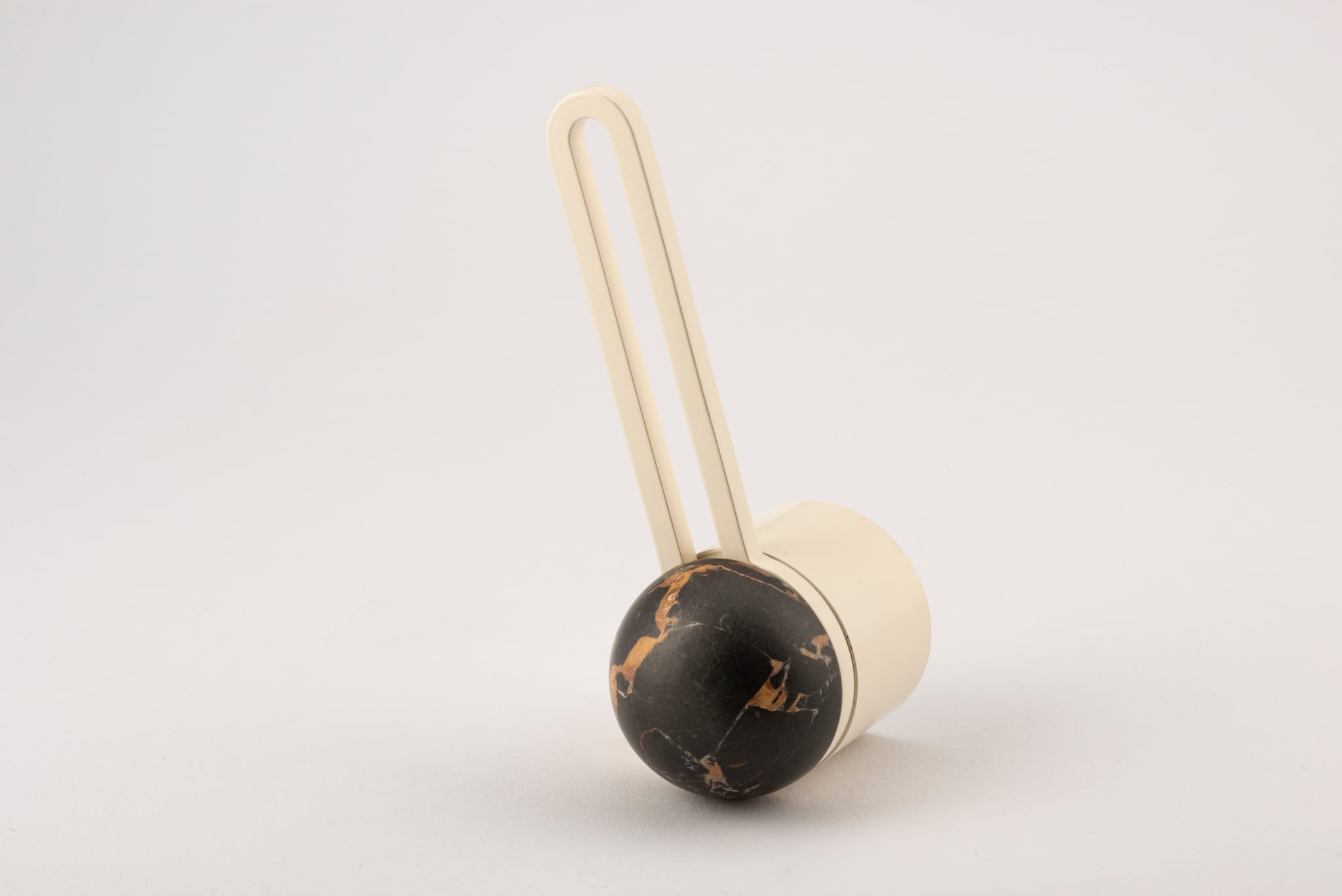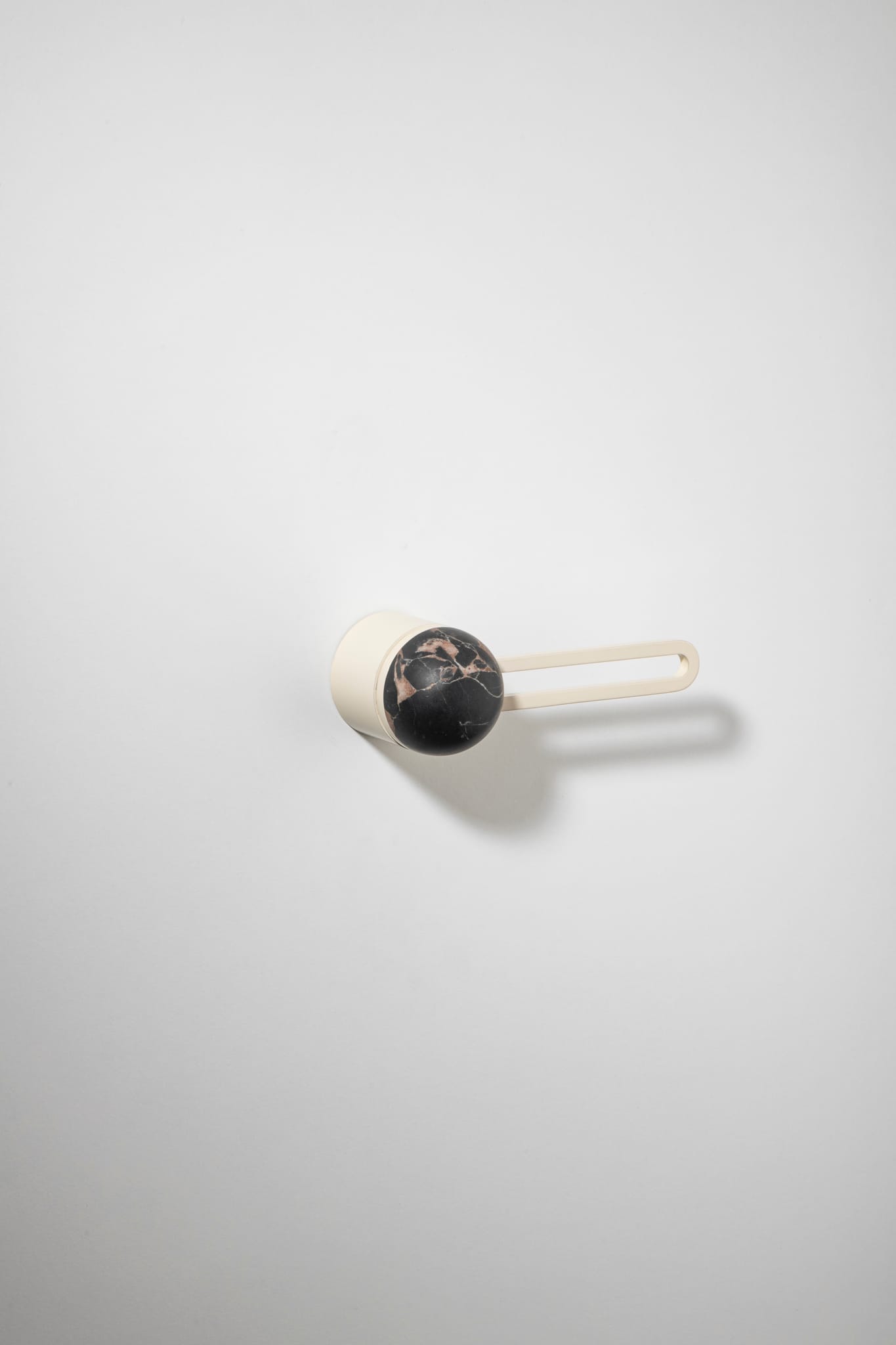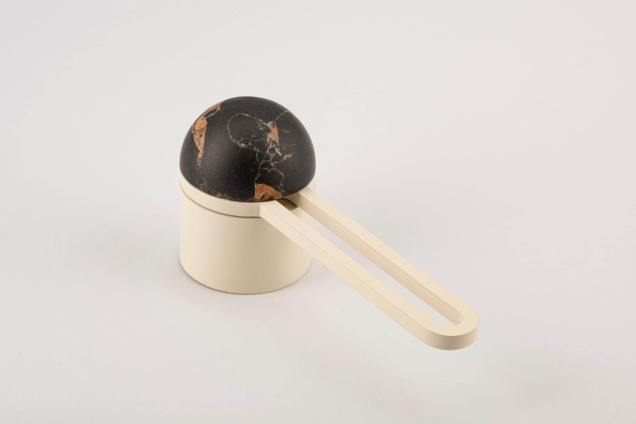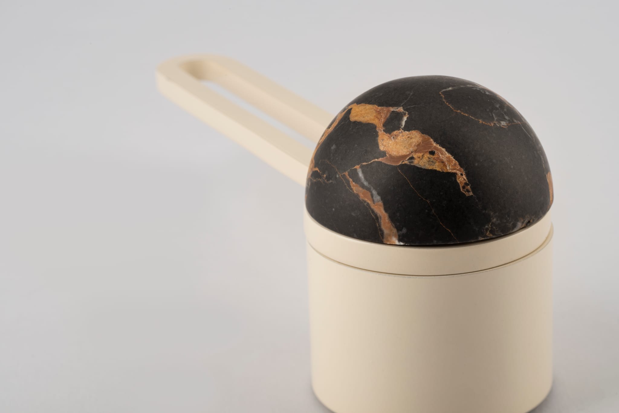 allows precise shaping into geometric contours, mirroring the appearance of a glazed enamel and delivers an unexpectedly cool touch. The tone, thoughtfully chosen, imparts a sense of warmth and timelessness, harmonising effortlessly with various materials, from marble to metals, to create a versatile and cohesive palette.