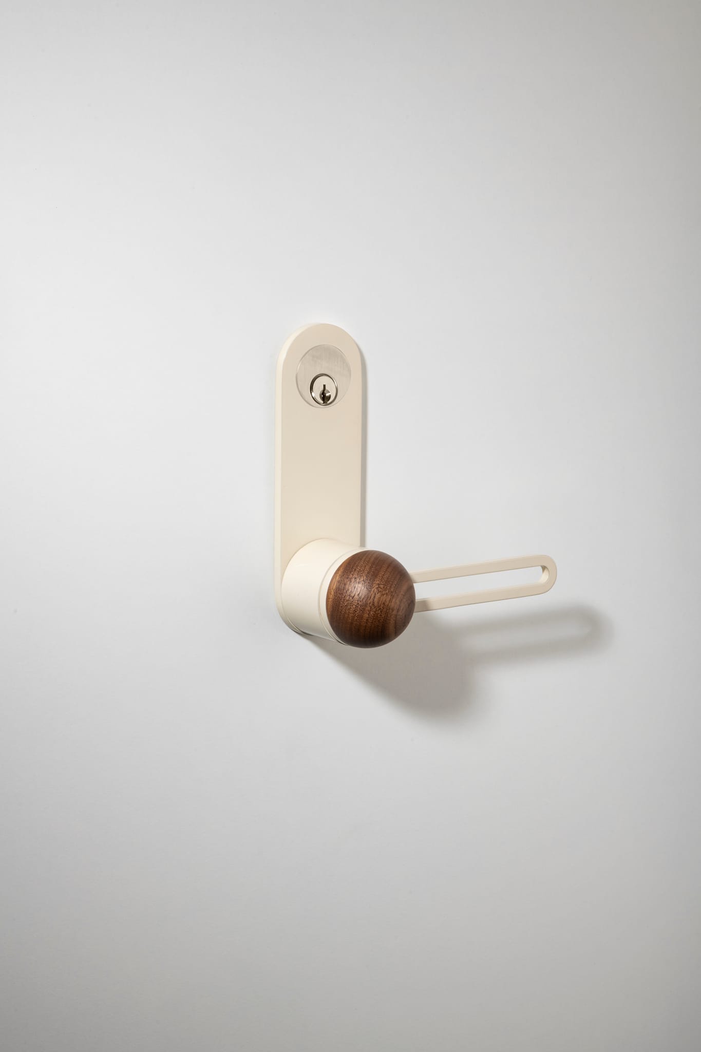The H01 Lever on Backplate design showcases an open-frame lever atop an oval backplate. With an option for an integrated lock mechanism, the design is low-profile, accented with Art Deco-inspired curves.