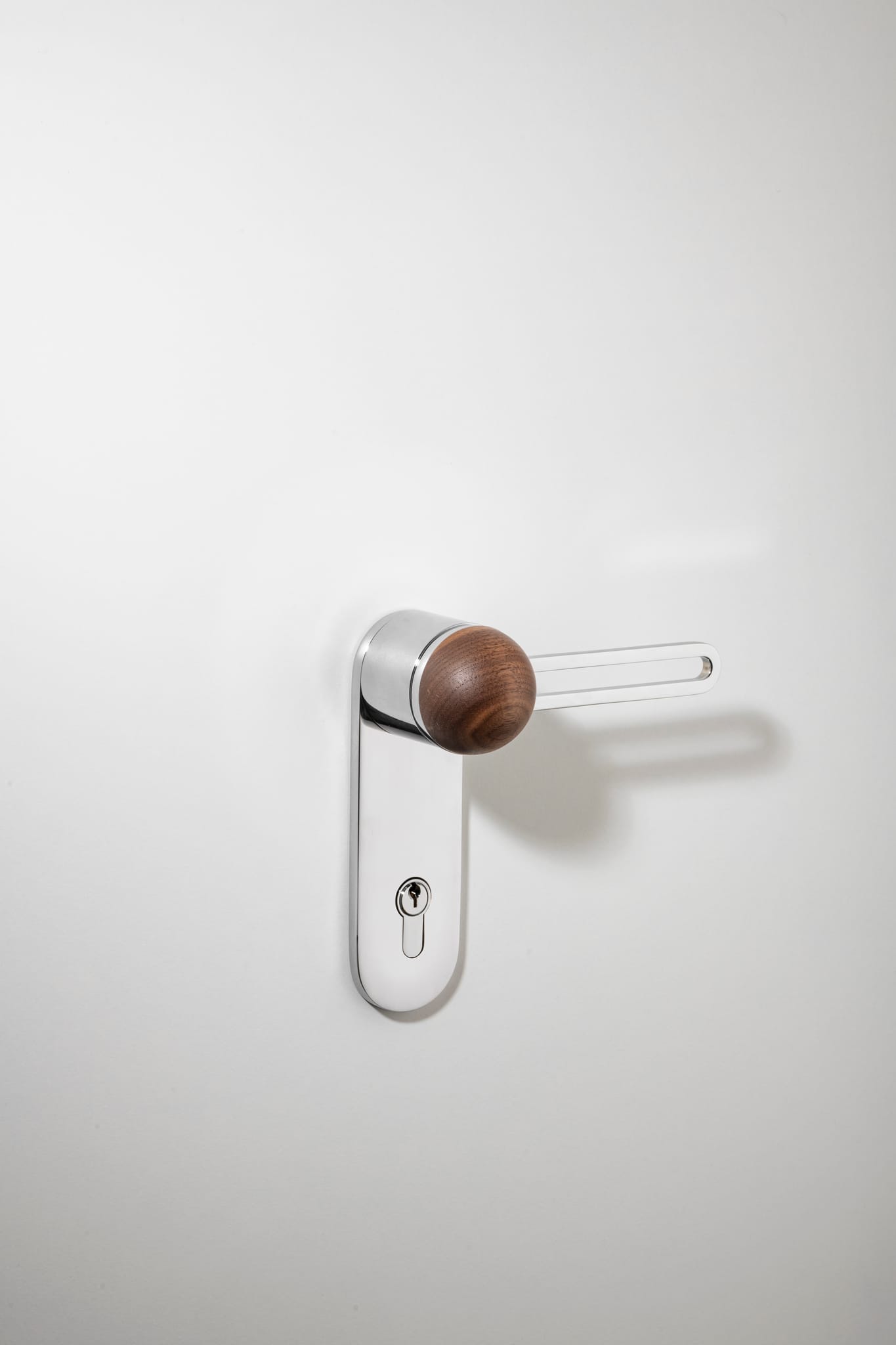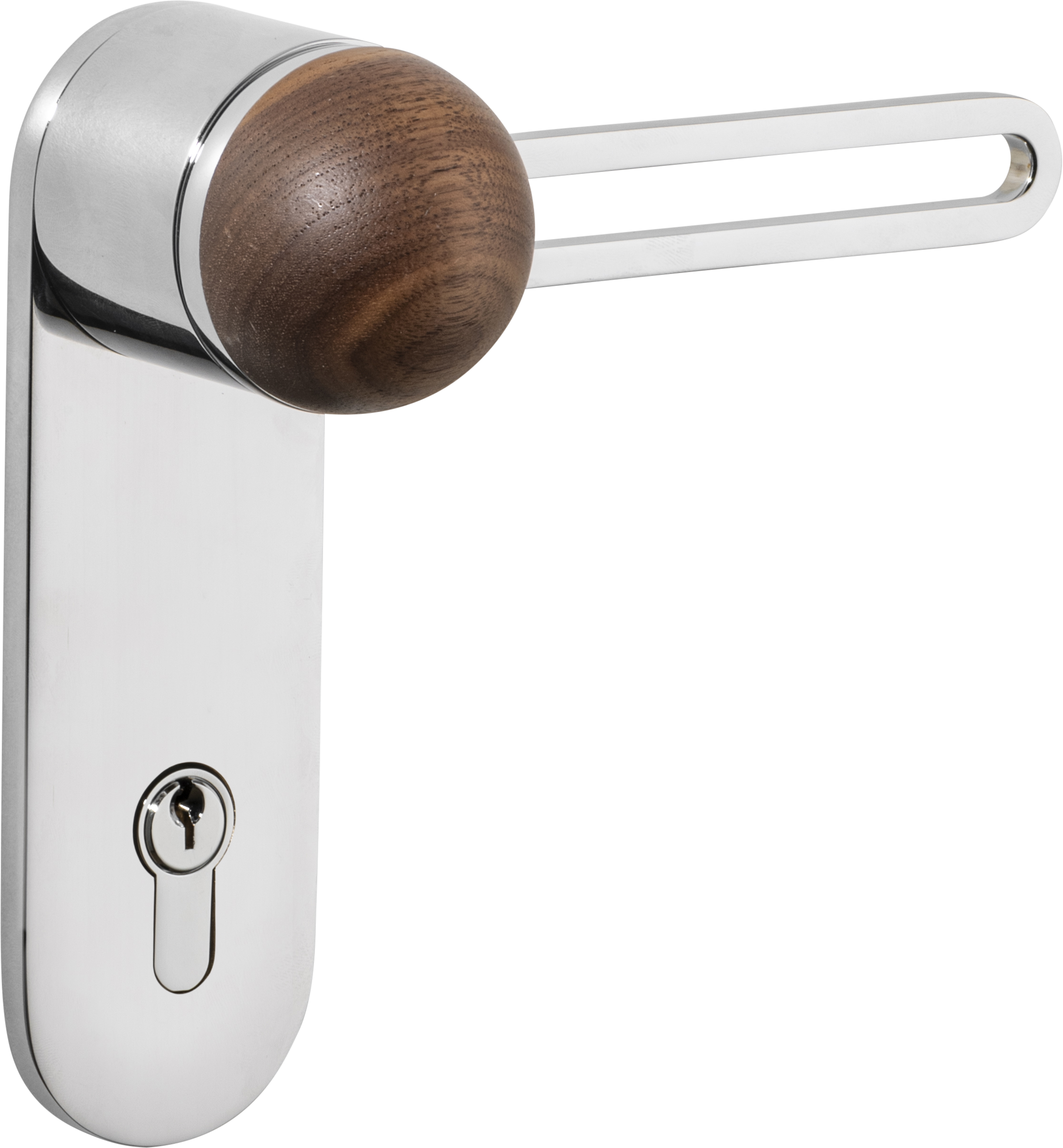 The H01 Lever on Backplate design showcases an open-frame lever atop an oval backplate. With an option for an integrated lock mechanism, the design is low-profile, accented with Art Deco-inspired curves.