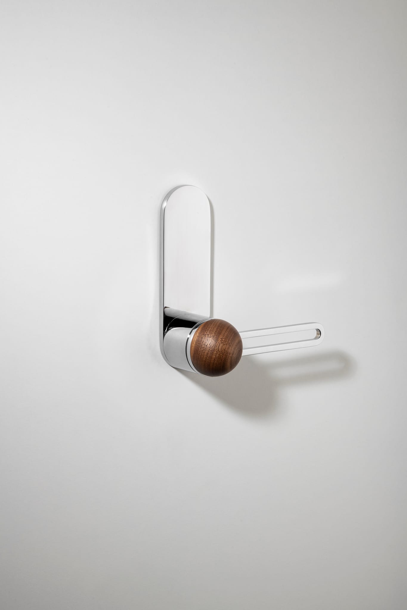 The H01 Lever on Backplate design showcases an open-frame lever atop an oval backplate. With an option for an integrated lock mechanism, the design is low-profile, accented with Art Deco-inspired curves.