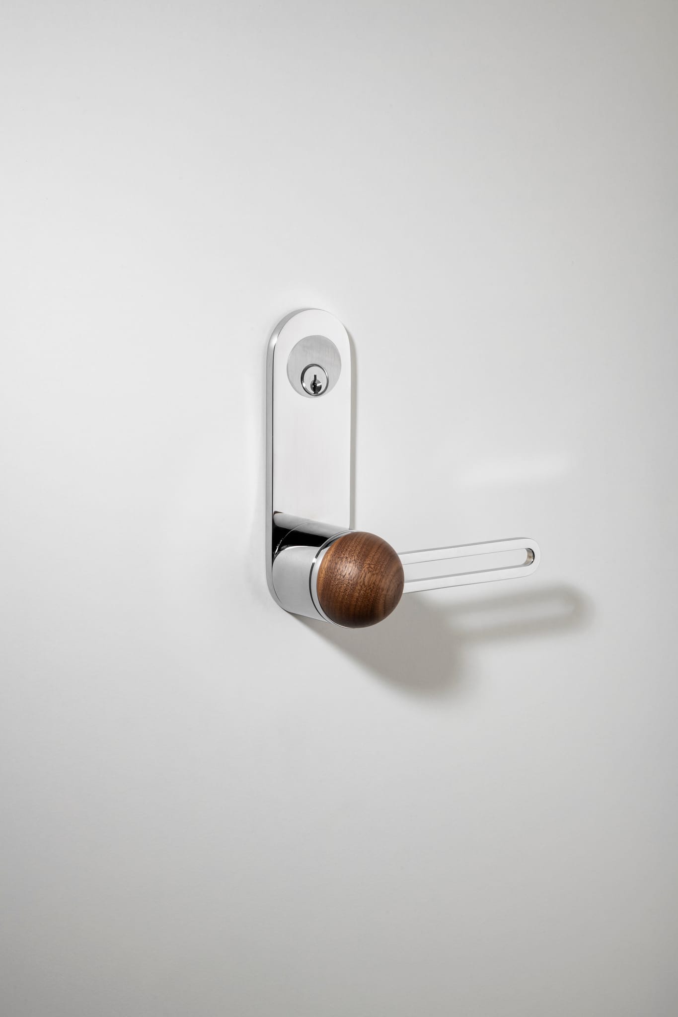 The H01 Lever on Backplate design showcases an open-frame lever atop an oval backplate. With an option for an integrated lock mechanism, the design is low-profile, accented with Art Deco-inspired curves.