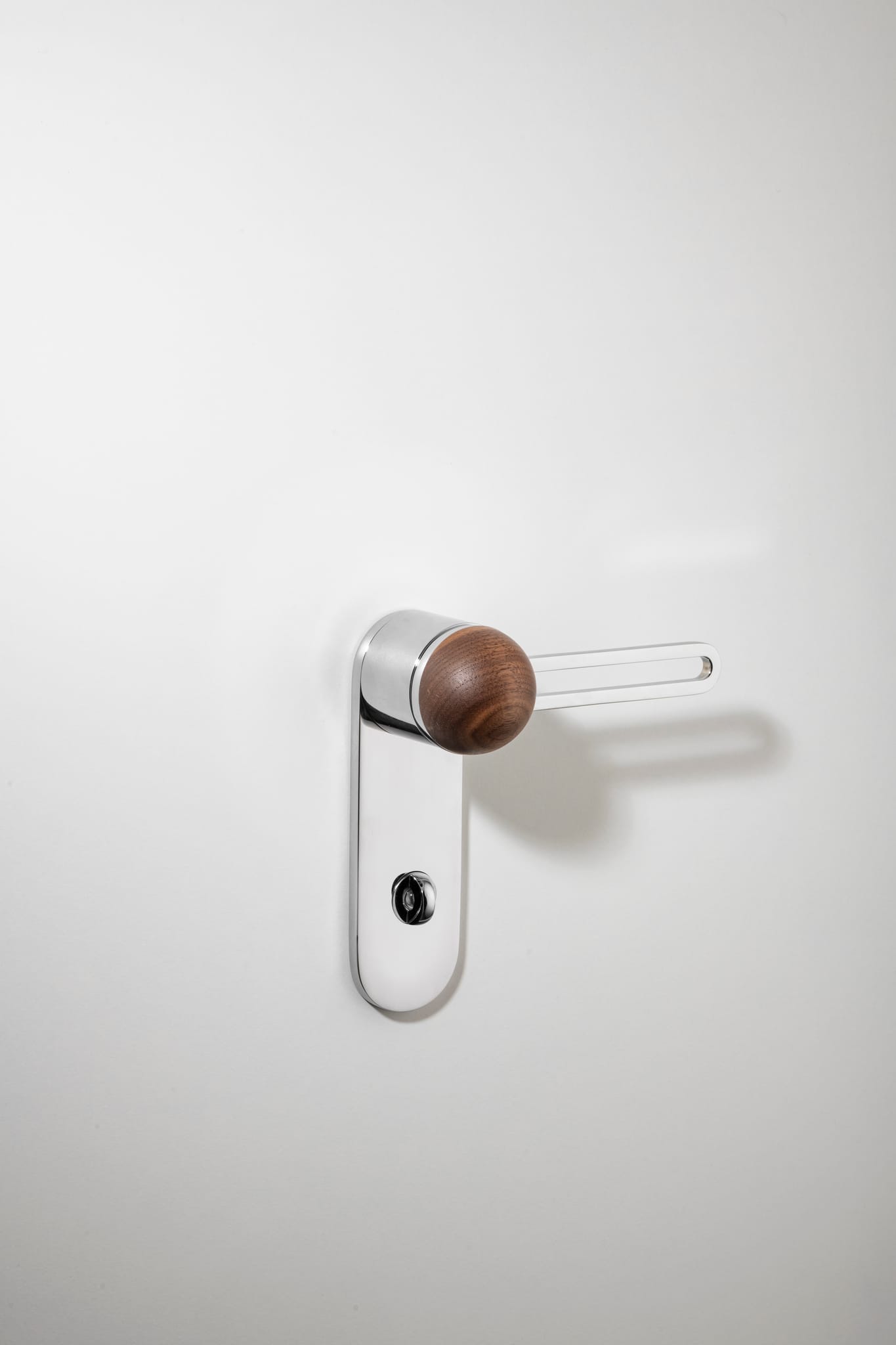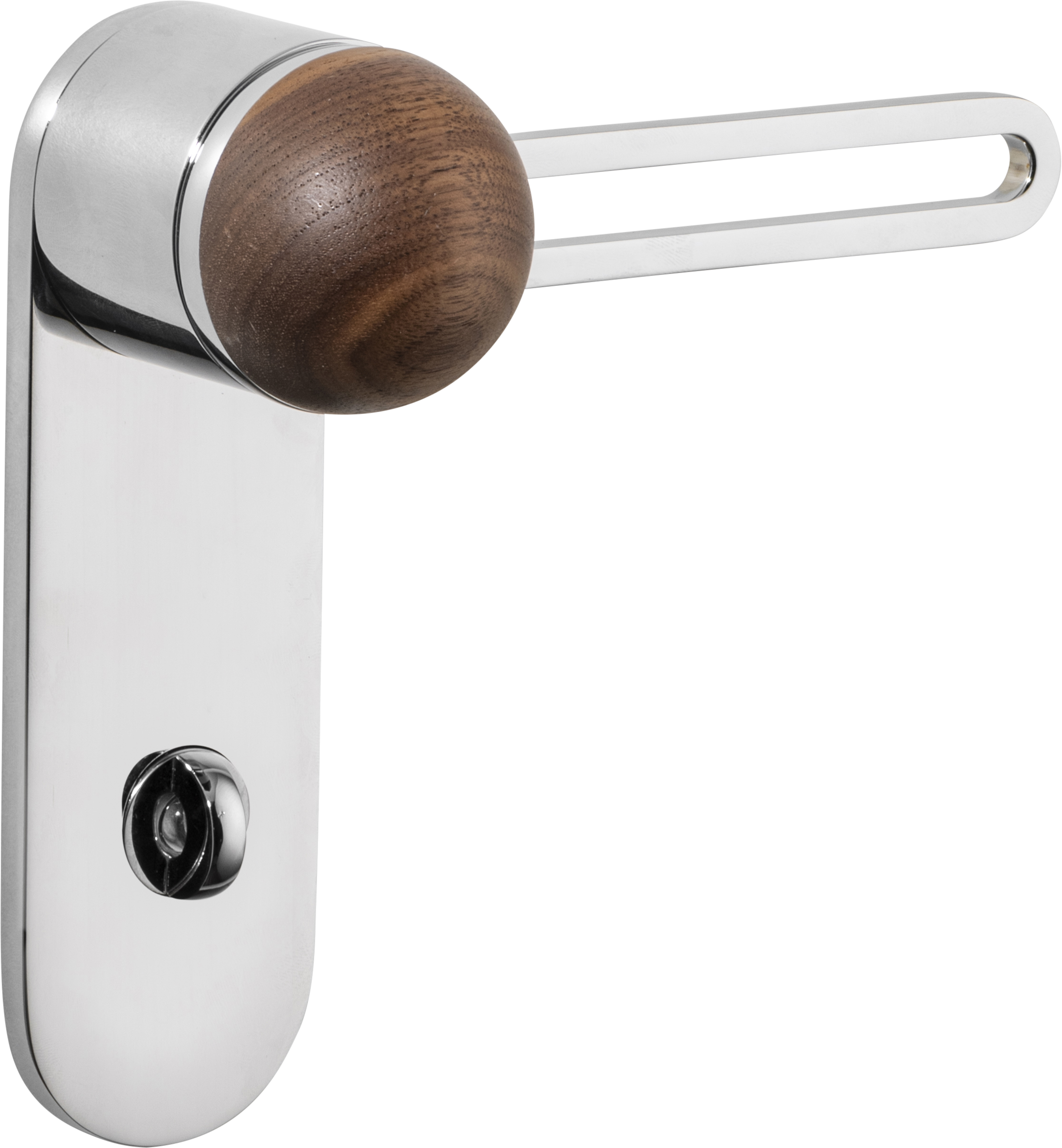 The H01 Lever on Backplate design showcases an open-frame lever atop an oval backplate. With an option for an integrated lock mechanism, the design is low-profile, accented with Art Deco-inspired curves.