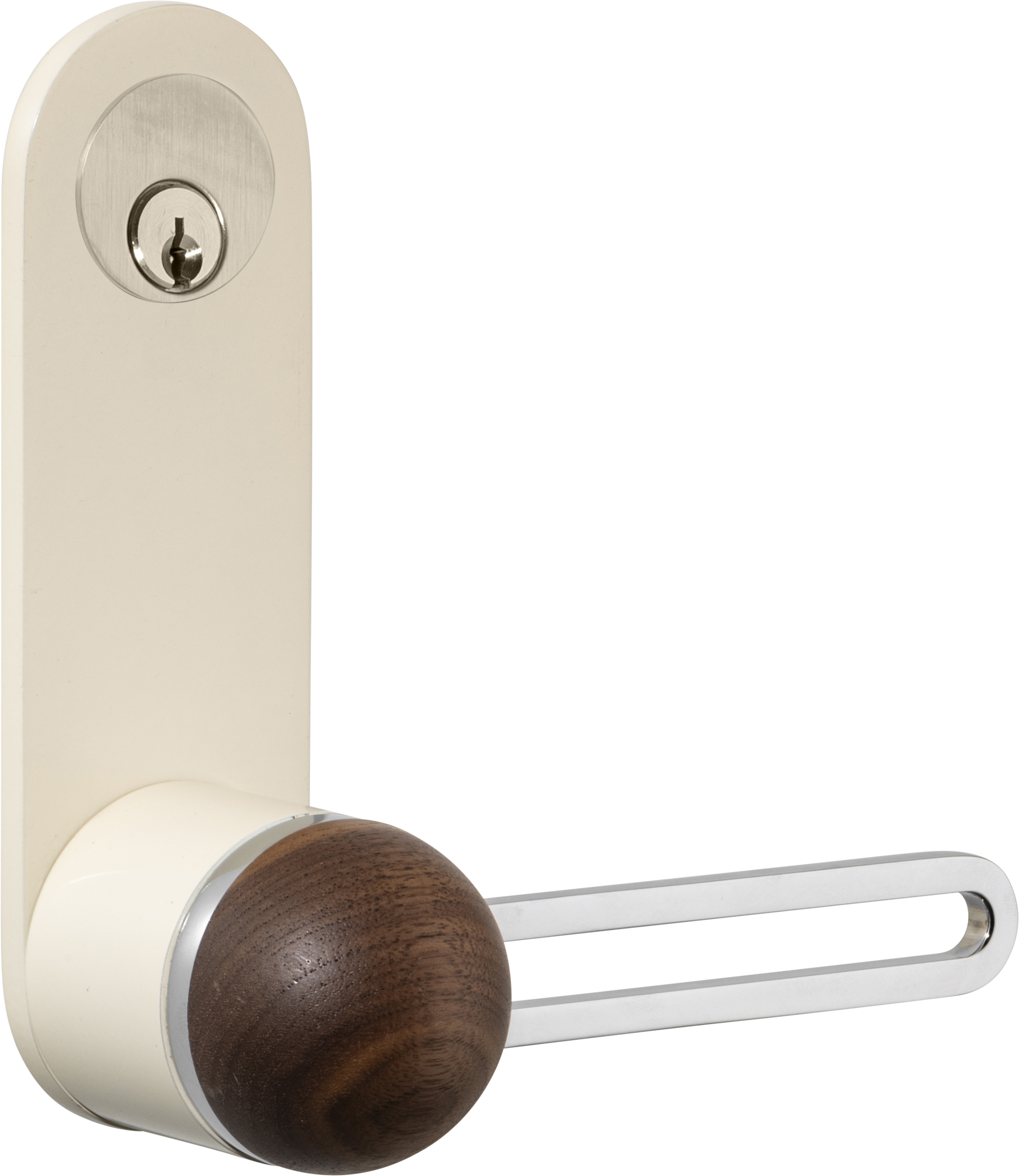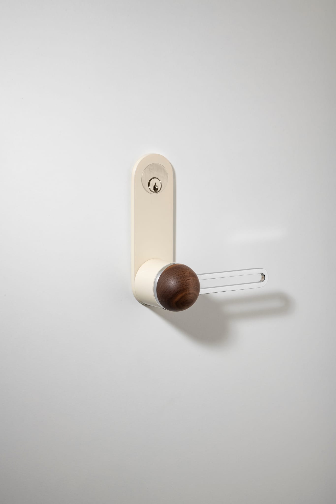The H01 Lever on Backplate design showcases an open-frame lever atop an oval backplate. With an option for an integrated lock mechanism, the design is low-profile, accented with Art Deco-inspired curves.