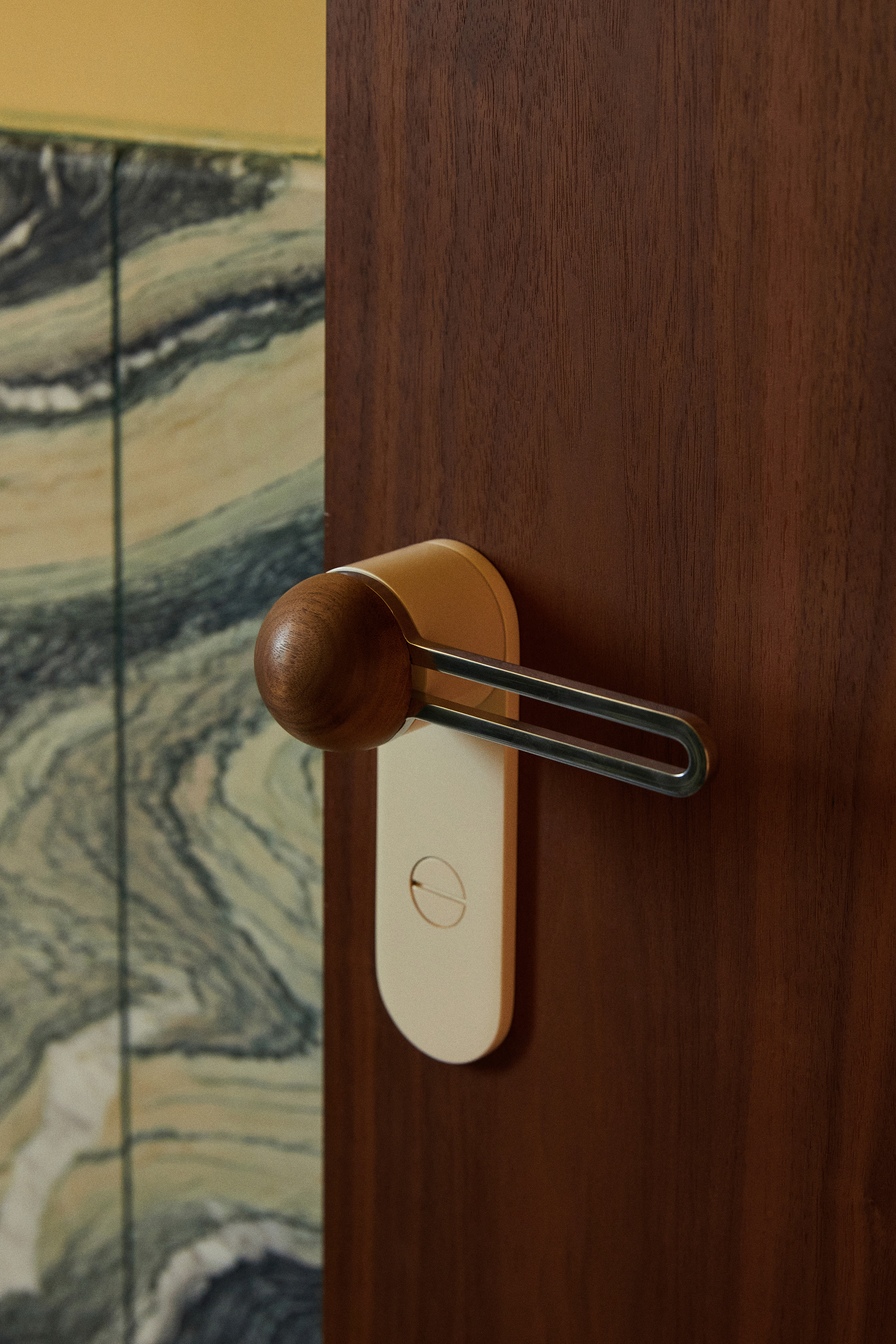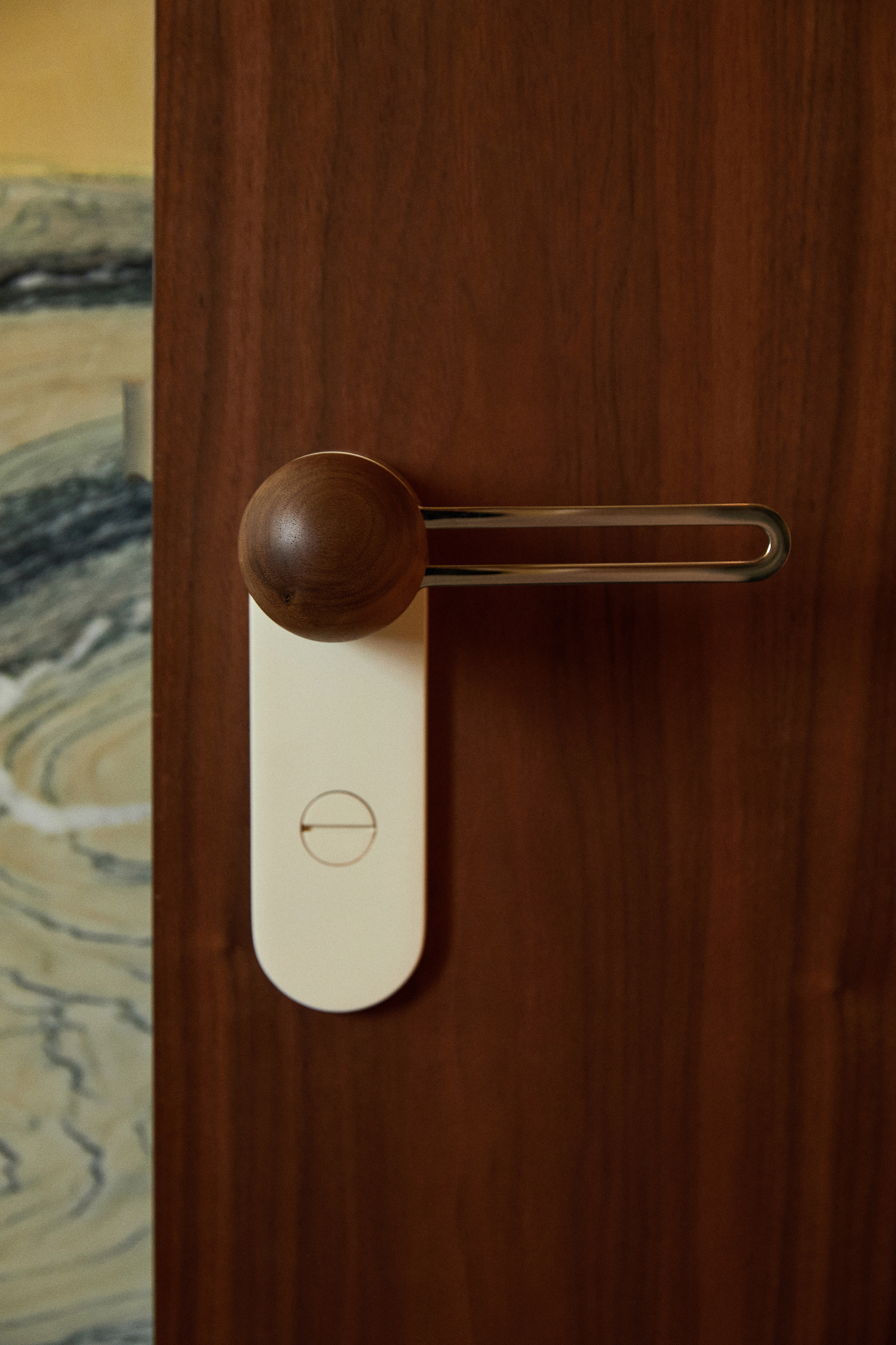 The H01 Lever on Backplate design showcases an open-frame lever atop an oval backplate. With an option for an integrated lock mechanism, the design is low-profile, accented with Art Deco-inspired curves.