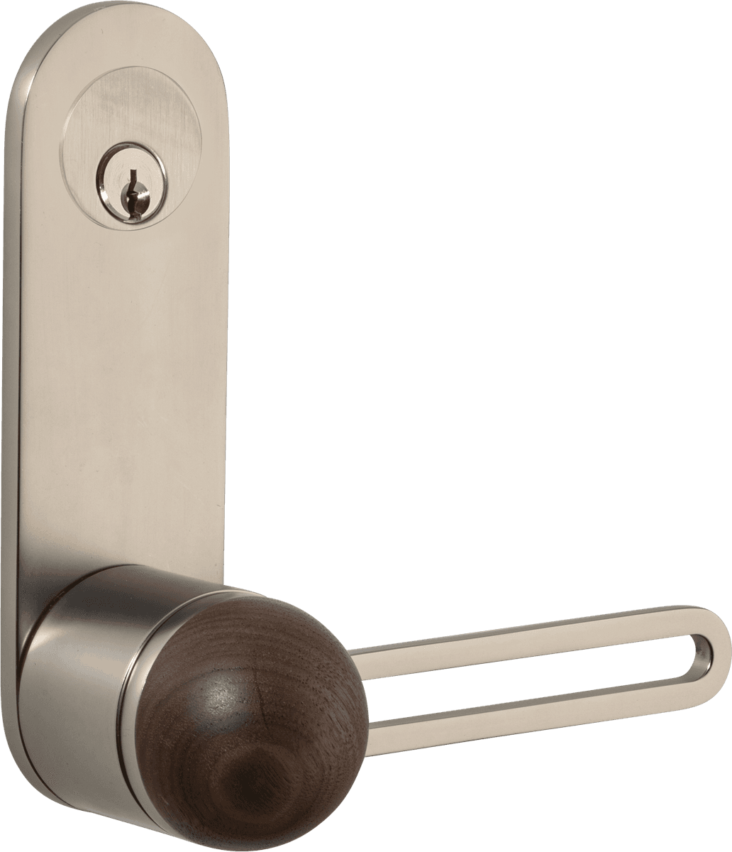 The H01 Lever on Backplate design showcases an open-frame lever atop an oval backplate. With an option for an integrated lock mechanism, the design is low-profile, accented with Art Deco-inspired curves.