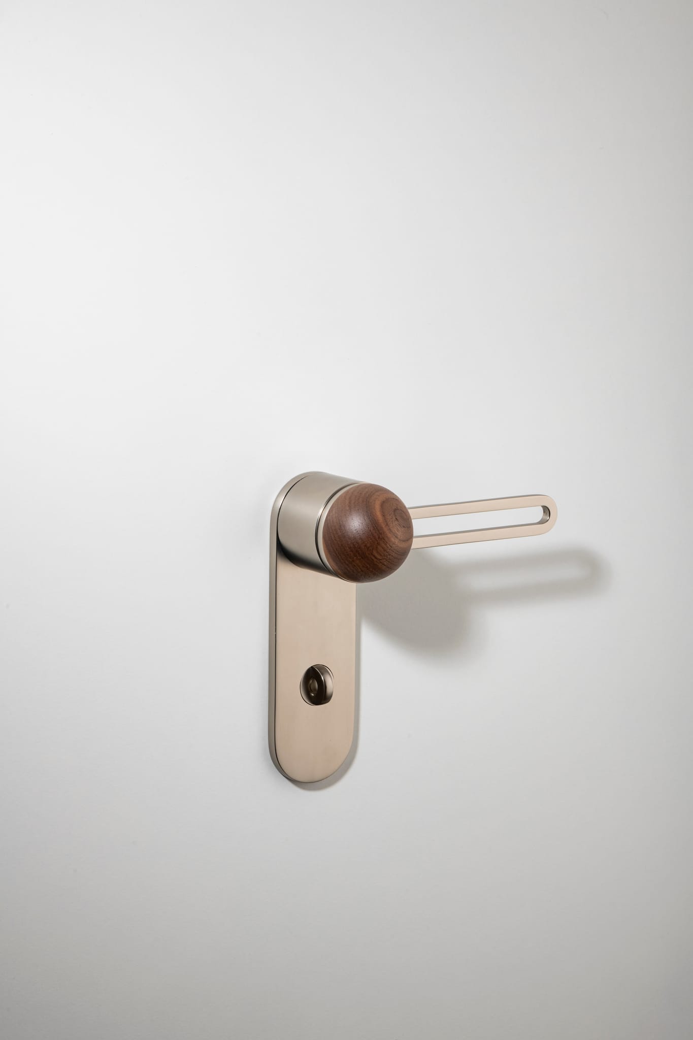 The H01 Lever on Backplate design showcases an open-frame lever atop an oval backplate. With an option for an integrated lock mechanism, the design is low-profile, accented with Art Deco-inspired curves.