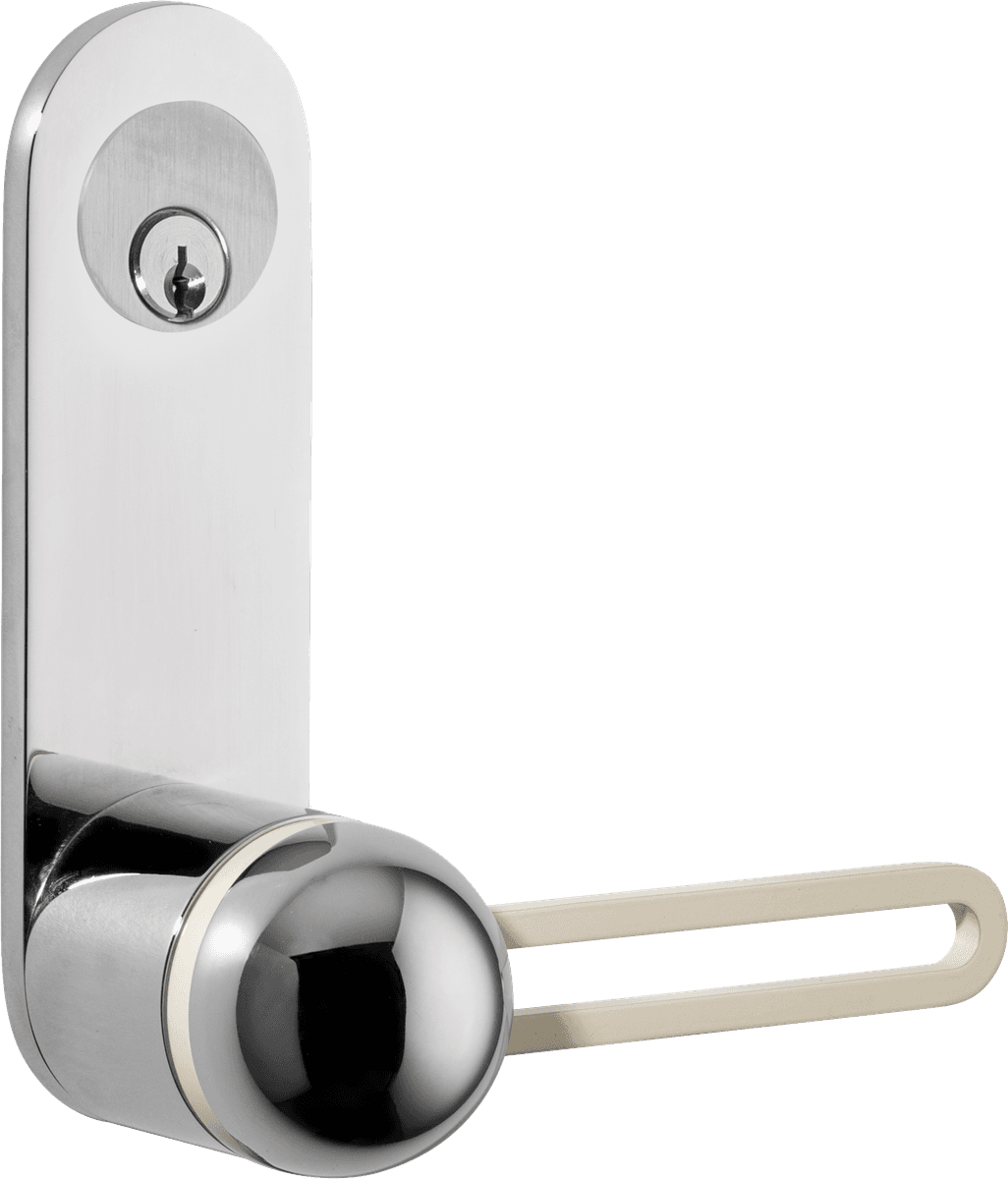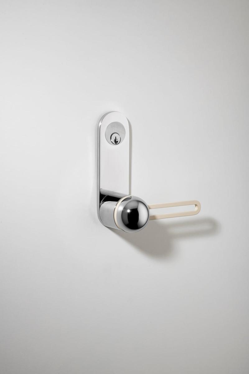 The H01 Lever on Backplate design showcases an open-frame lever atop an oval backplate. With an option for an integrated lock mechanism, the design is low-profile, accented with Art Deco-inspired curves.