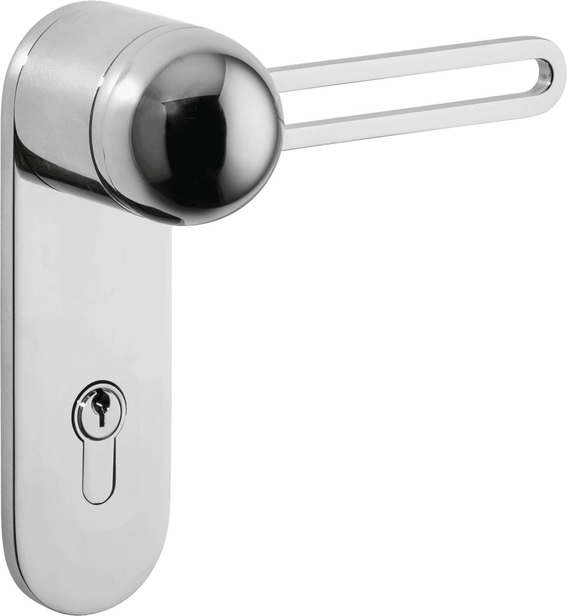 The H01 Lever on Backplate design showcases an open-frame lever atop an oval backplate. With an option for an integrated lock mechanism, the design is low-profile, accented with Art Deco-inspired curves.