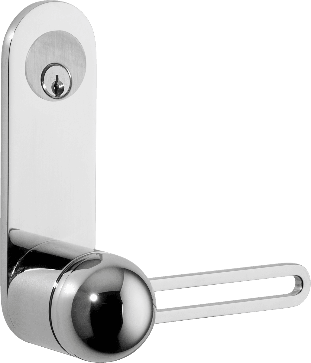 The H01 Lever on Backplate design showcases an open-frame lever atop an oval backplate. With an option for an integrated lock mechanism, the design is low-profile, accented with Art Deco-inspired curves.