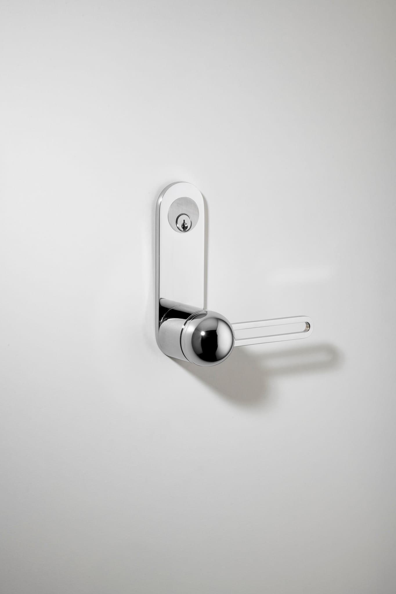 The H01 Lever on Backplate design showcases an open-frame lever atop an oval backplate. With an option for an integrated lock mechanism, the design is low-profile, accented with Art Deco-inspired curves.
