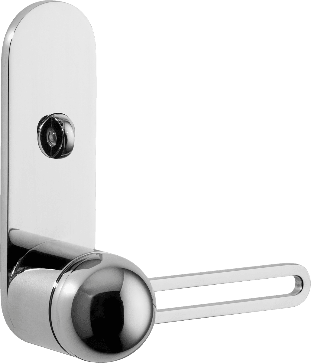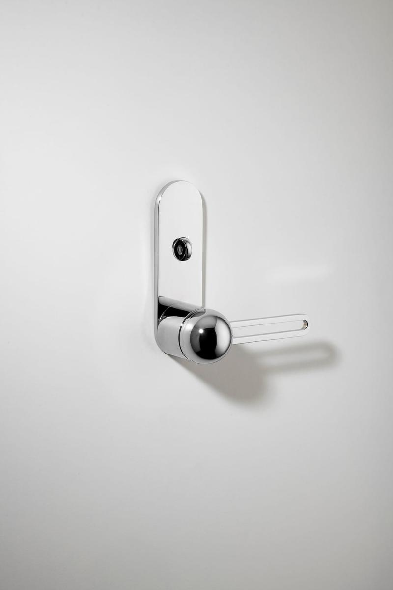The H01 Lever on Backplate design showcases an open-frame lever atop an oval backplate. With an option for an integrated lock mechanism, the design is low-profile, accented with Art Deco-inspired curves.