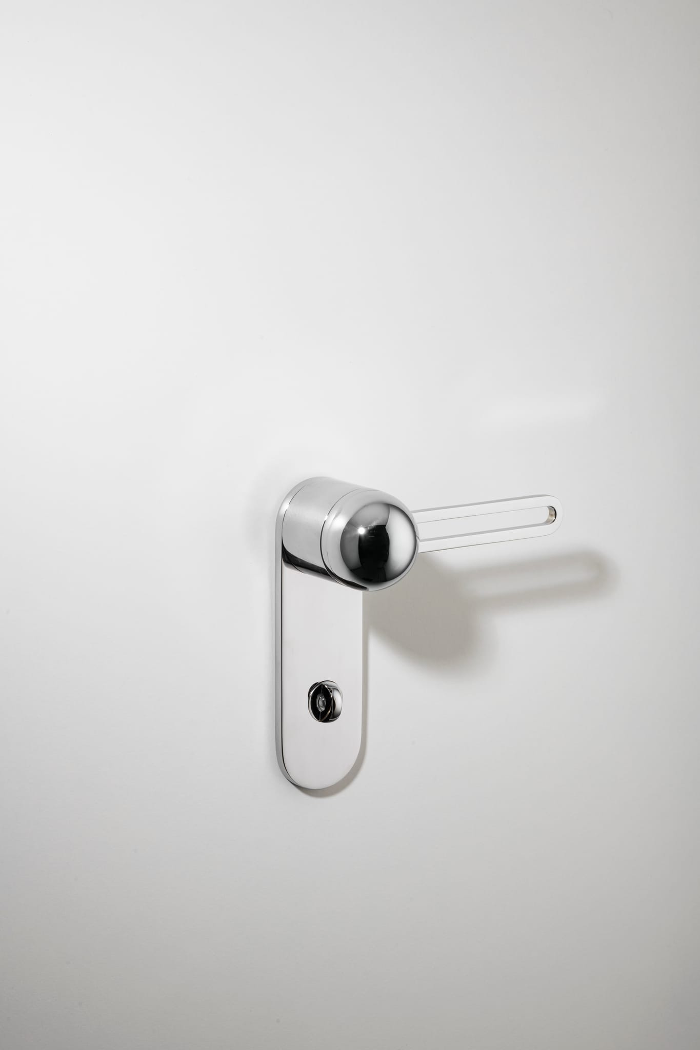The H01 Lever on Backplate design showcases an open-frame lever atop an oval backplate. With an option for an integrated lock mechanism, the design is low-profile, accented with Art Deco-inspired curves.