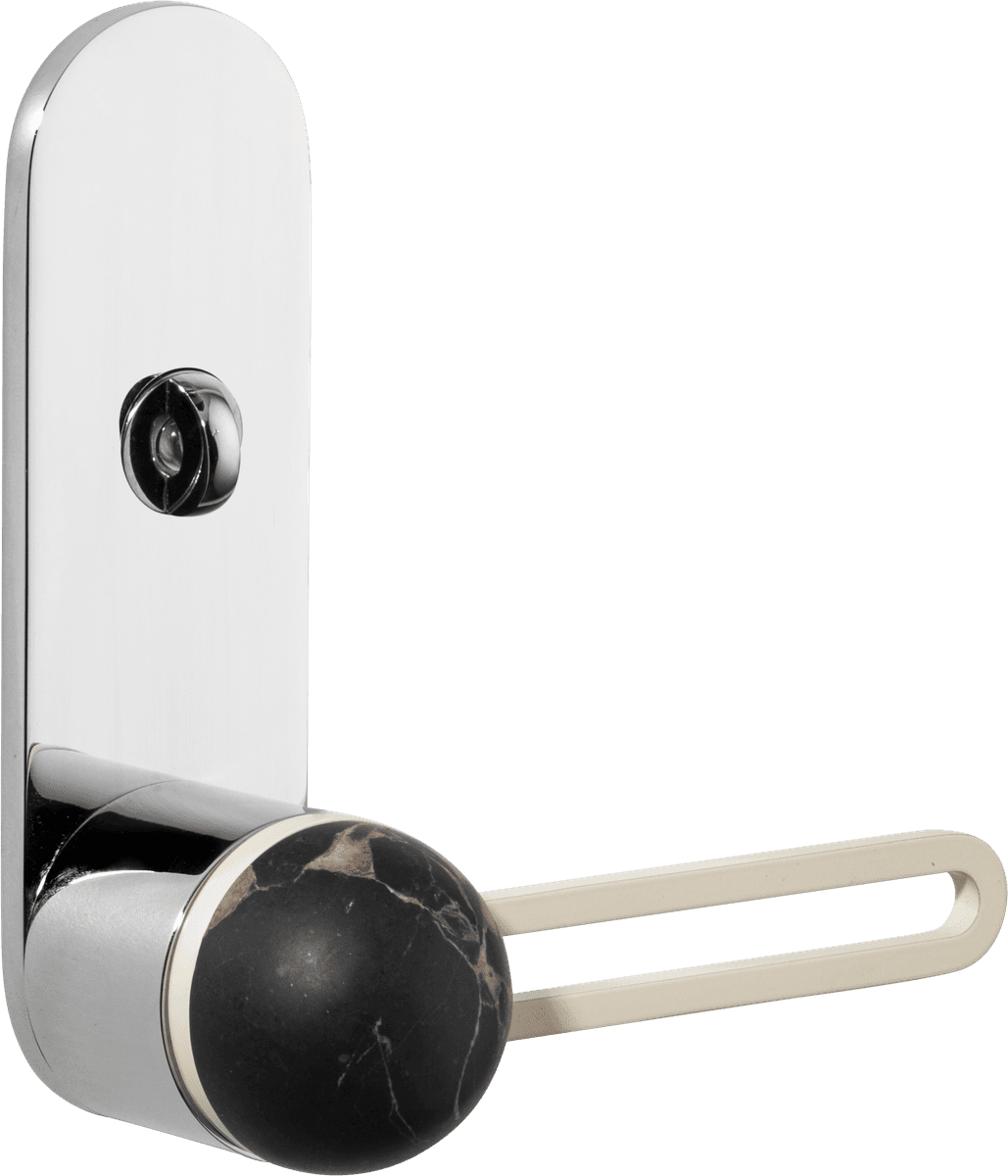 The H01 Lever on Backplate design showcases an open-frame lever atop an oval backplate. With an option for an integrated lock mechanism, the design is low-profile, accented with Art Deco-inspired curves.