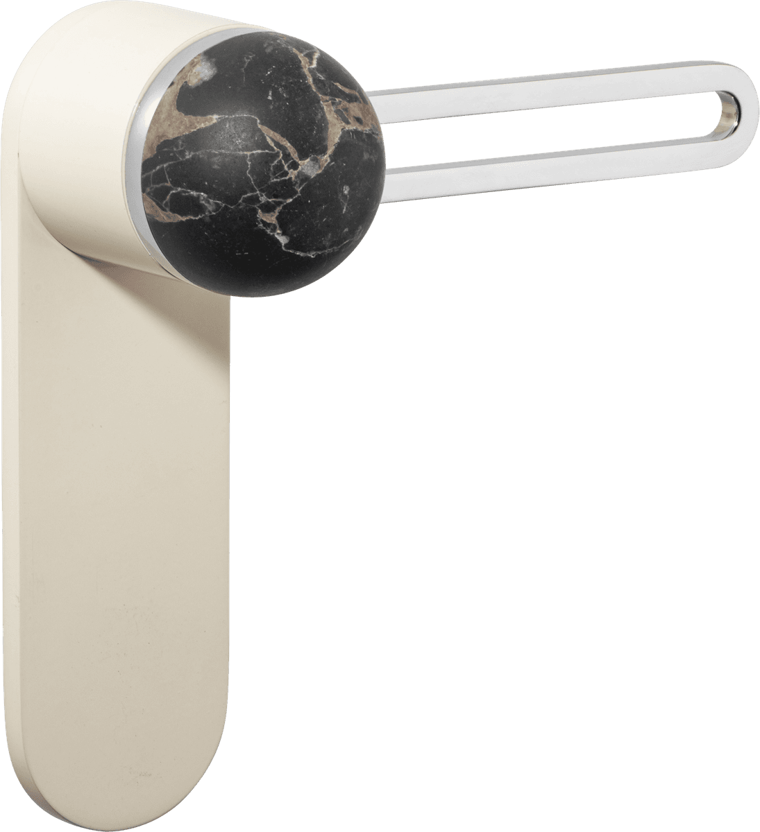 The H01 Lever on Backplate design showcases an open-frame lever atop an oval backplate. With an option for an integrated lock mechanism, the design is low-profile, accented with Art Deco-inspired curves.