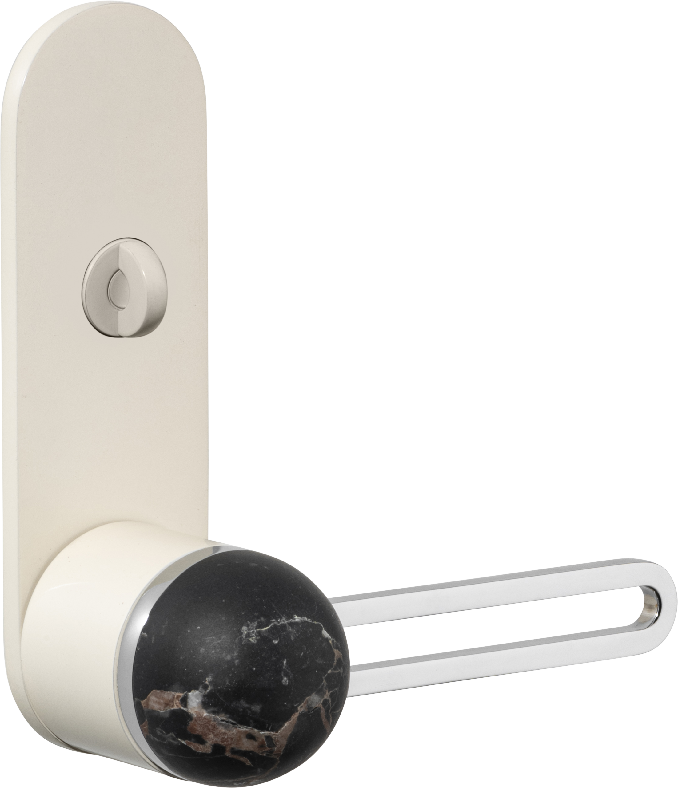 The H01 Lever on Backplate design showcases an open-frame lever atop an oval backplate. With an option for an integrated lock mechanism, the design is low-profile, accented with Art Deco-inspired curves.