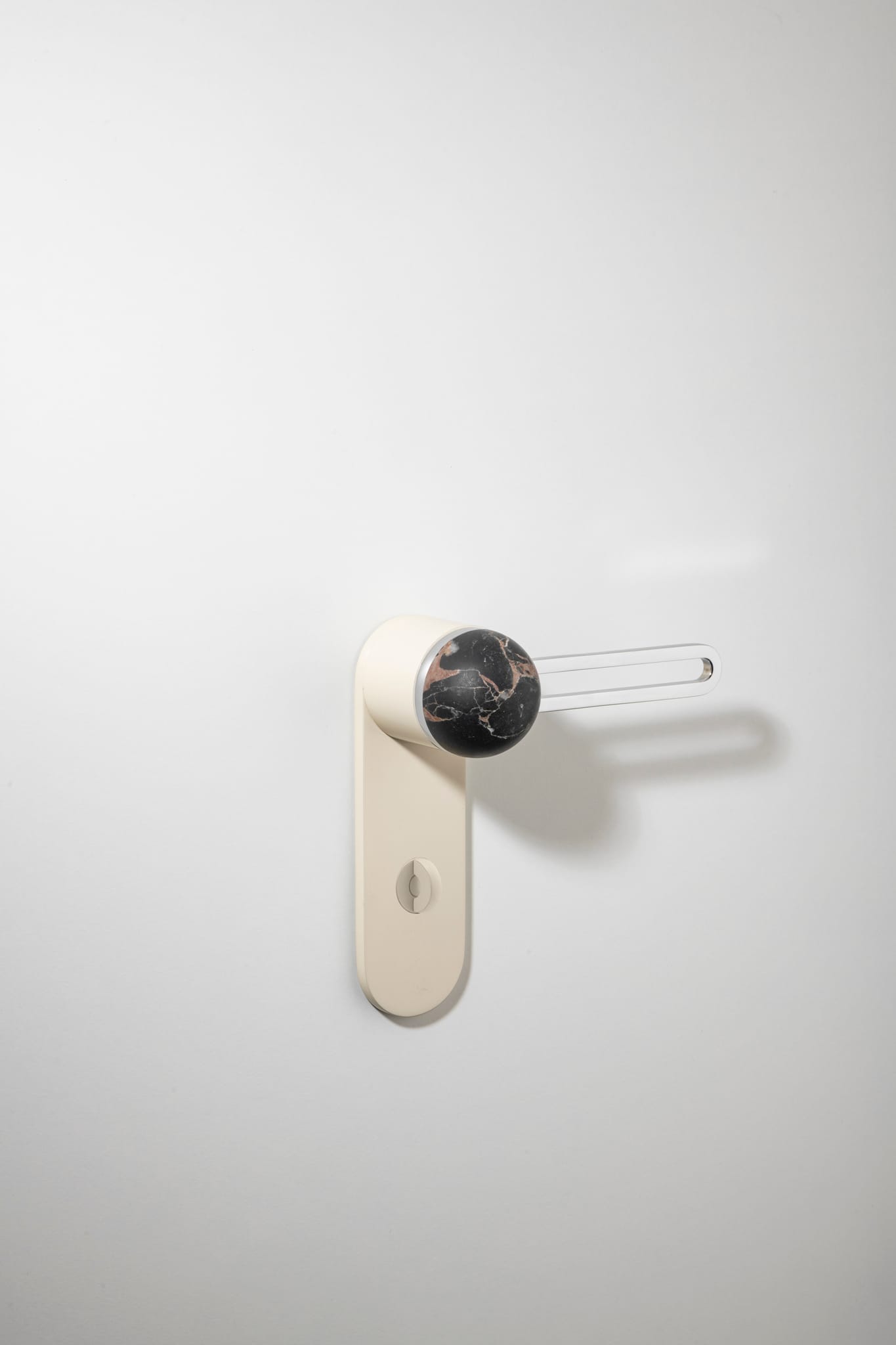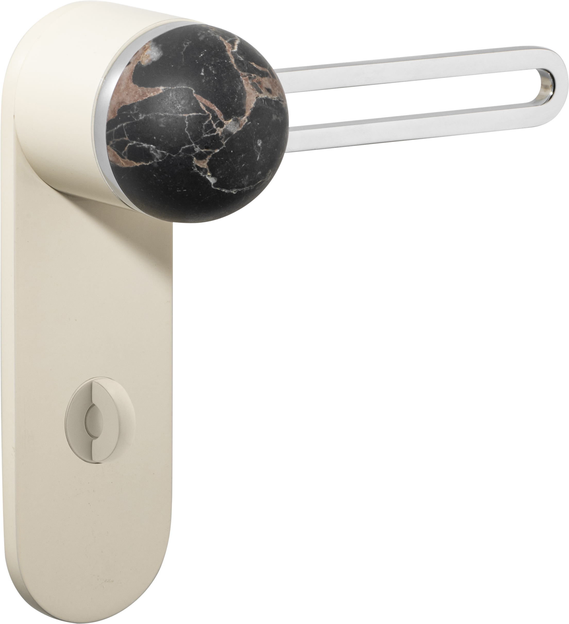 The H01 Lever on Backplate design showcases an open-frame lever atop an oval backplate. With an option for an integrated lock mechanism, the design is low-profile, accented with Art Deco-inspired curves.