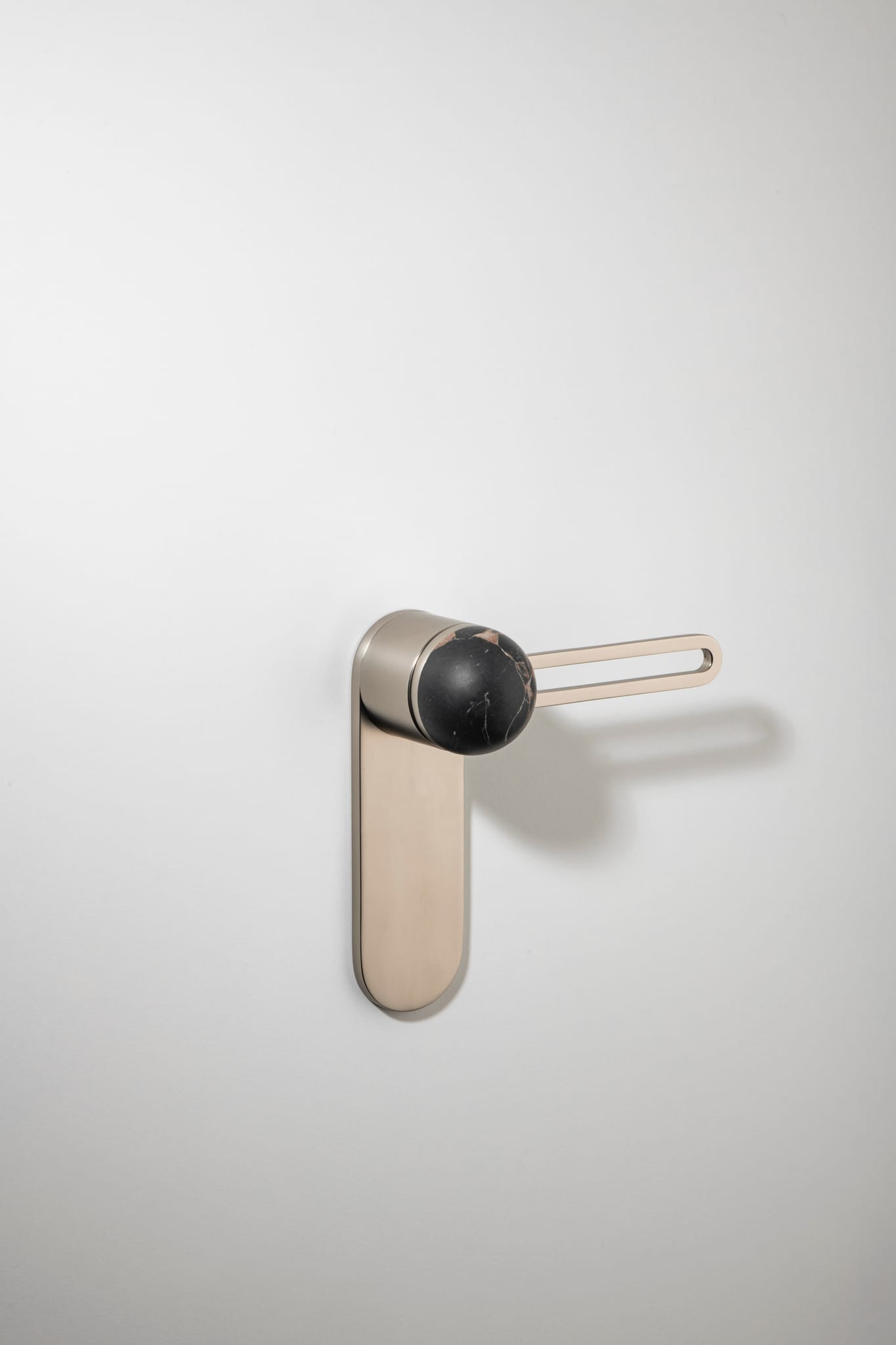 The H01 Lever on Backplate design showcases an open-frame lever atop an oval backplate. With an option for an integrated lock mechanism, the design is low-profile, accented with Art Deco-inspired curves.