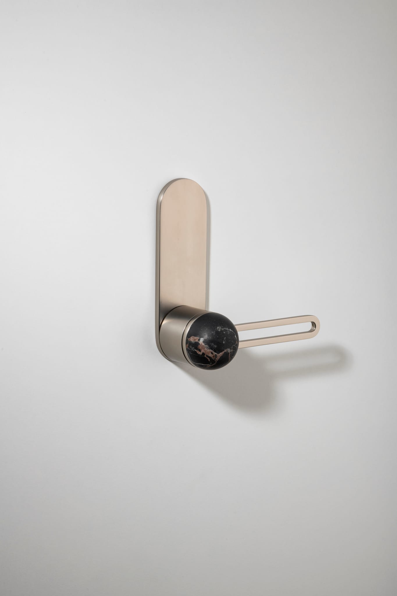 The H01 Lever on Backplate design showcases an open-frame lever atop an oval backplate. With an option for an integrated lock mechanism, the design is low-profile, accented with Art Deco-inspired curves.