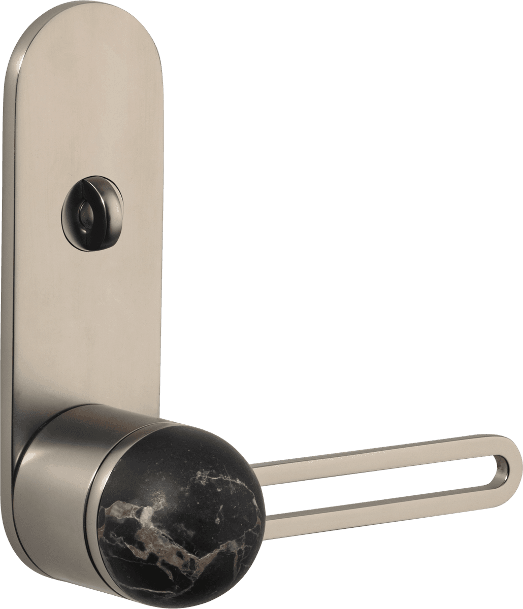 The H01 Lever on Backplate design showcases an open-frame lever atop an oval backplate. With an option for an integrated lock mechanism, the design is low-profile, accented with Art Deco-inspired curves.
