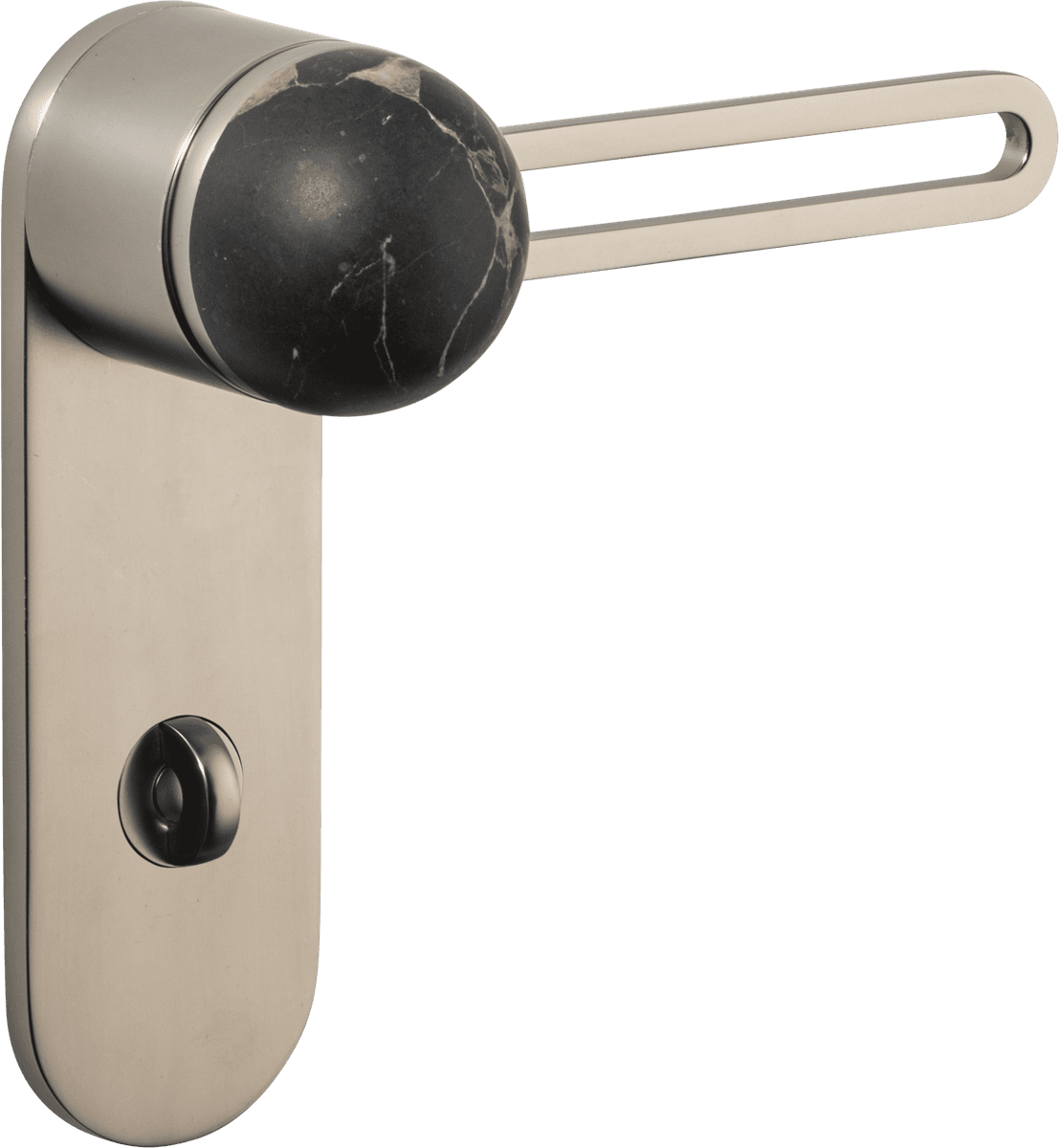 The H01 Lever on Backplate design showcases an open-frame lever atop an oval backplate. With an option for an integrated lock mechanism, the design is low-profile, accented with Art Deco-inspired curves.