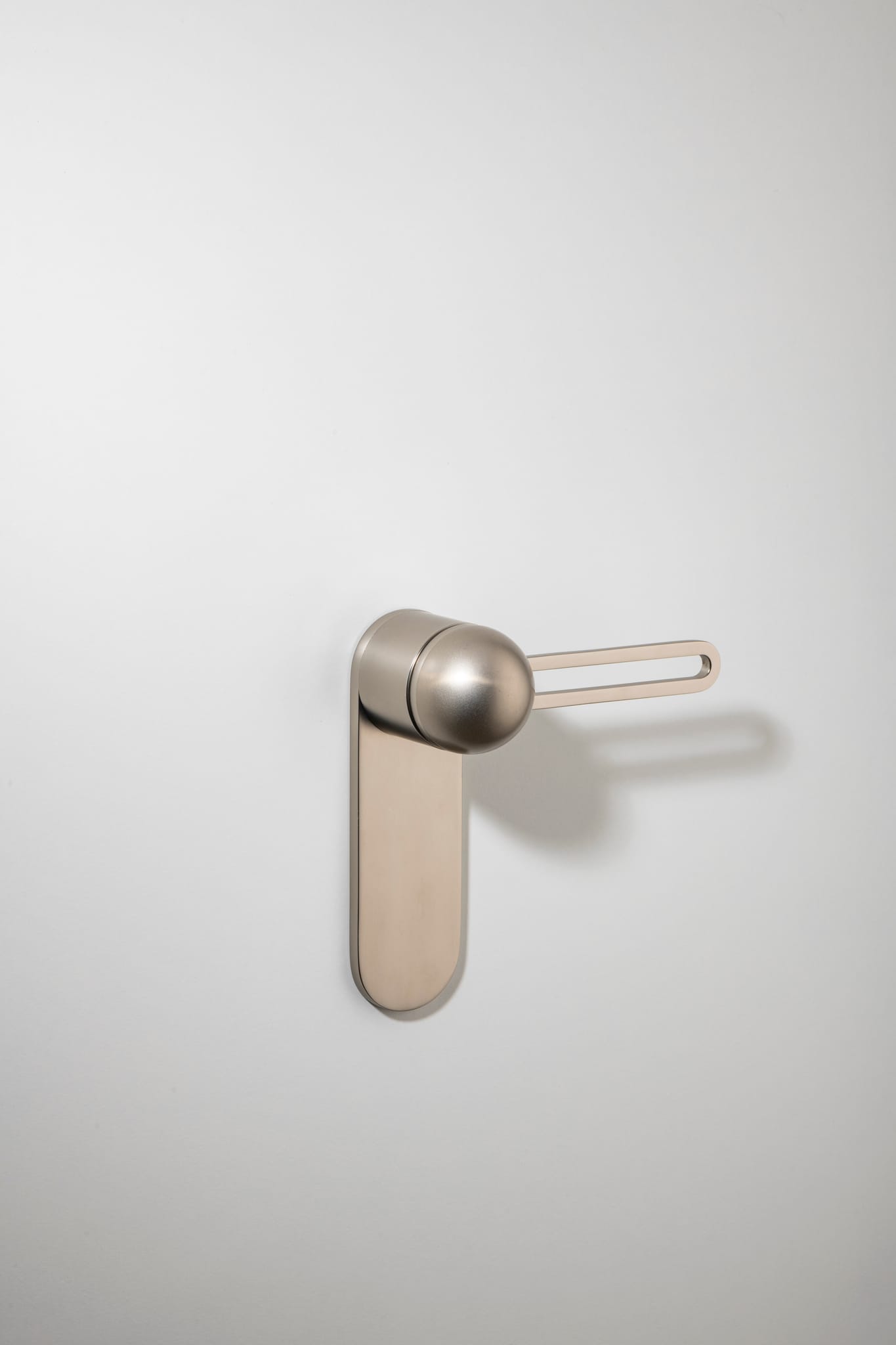 The H01 Lever on Backplate design showcases an open-frame lever atop an oval backplate. With an option for an integrated lock mechanism, the design is low-profile, accented with Art Deco-inspired curves.