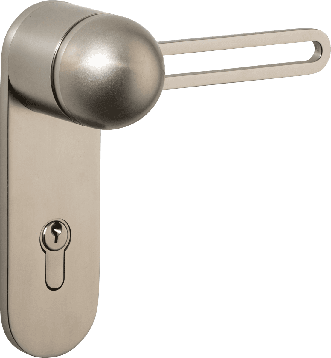 The H01 Lever on Backplate design showcases an open-frame lever atop an oval backplate. With an option for an integrated lock mechanism, the design is low-profile, accented with Art Deco-inspired curves.