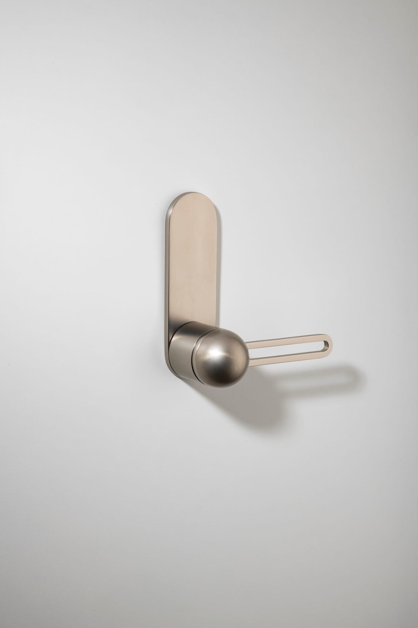 The H01 Lever on Backplate design showcases an open-frame lever atop an oval backplate. With an option for an integrated lock mechanism, the design is low-profile, accented with Art Deco-inspired curves.