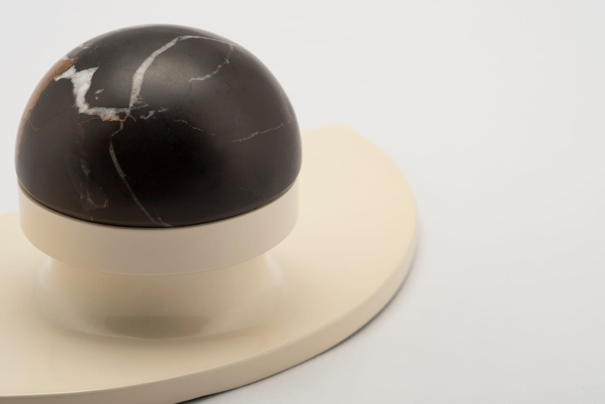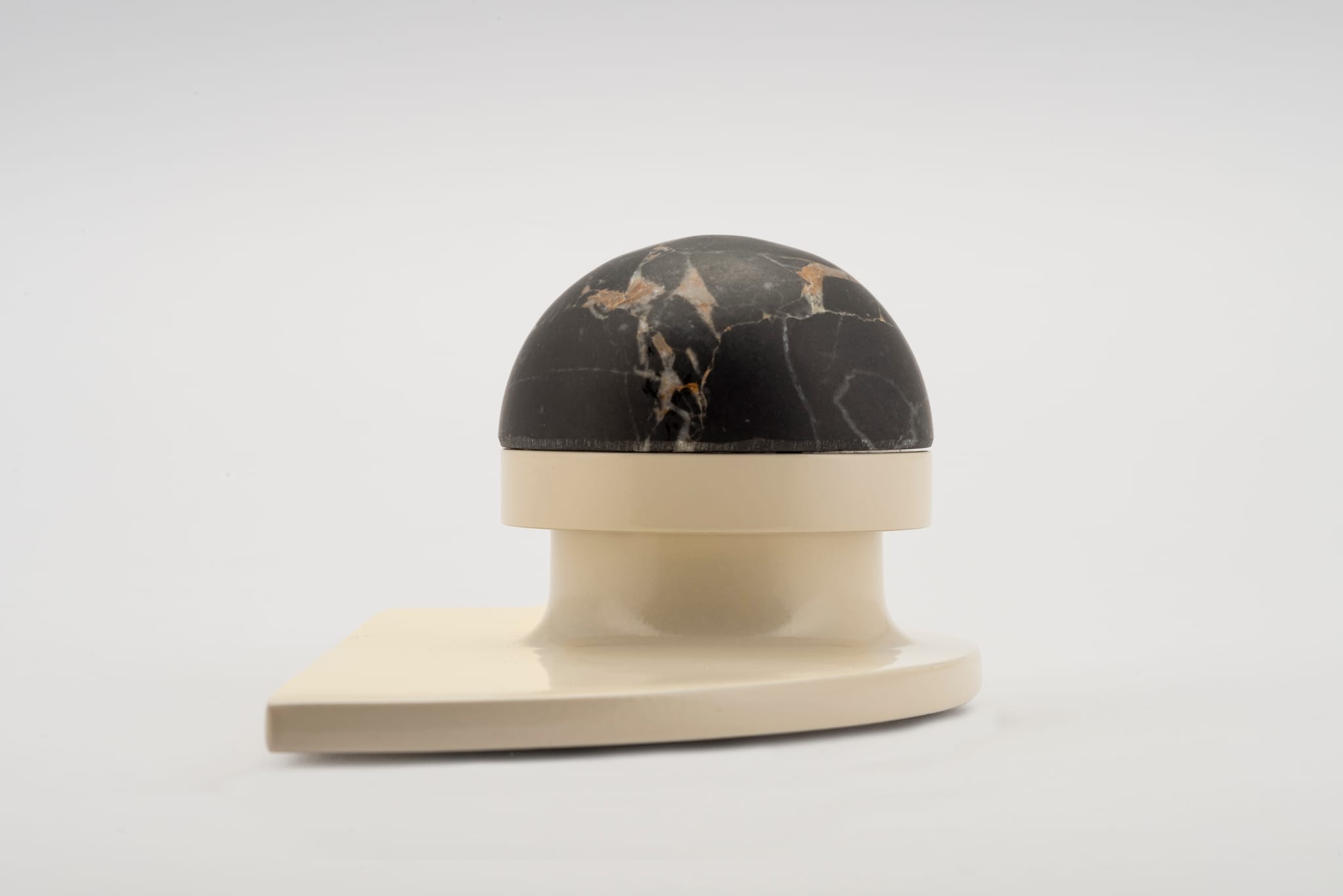 allows precise shaping into geometric contours, mirroring the appearance of a glazed enamel and delivers an unexpectedly cool touch. The tone, thoughtfully chosen, imparts a sense of warmth and timelessness, harmonising effortlessly with various materials, from marble to metals, to create a versatile and cohesive palette.
