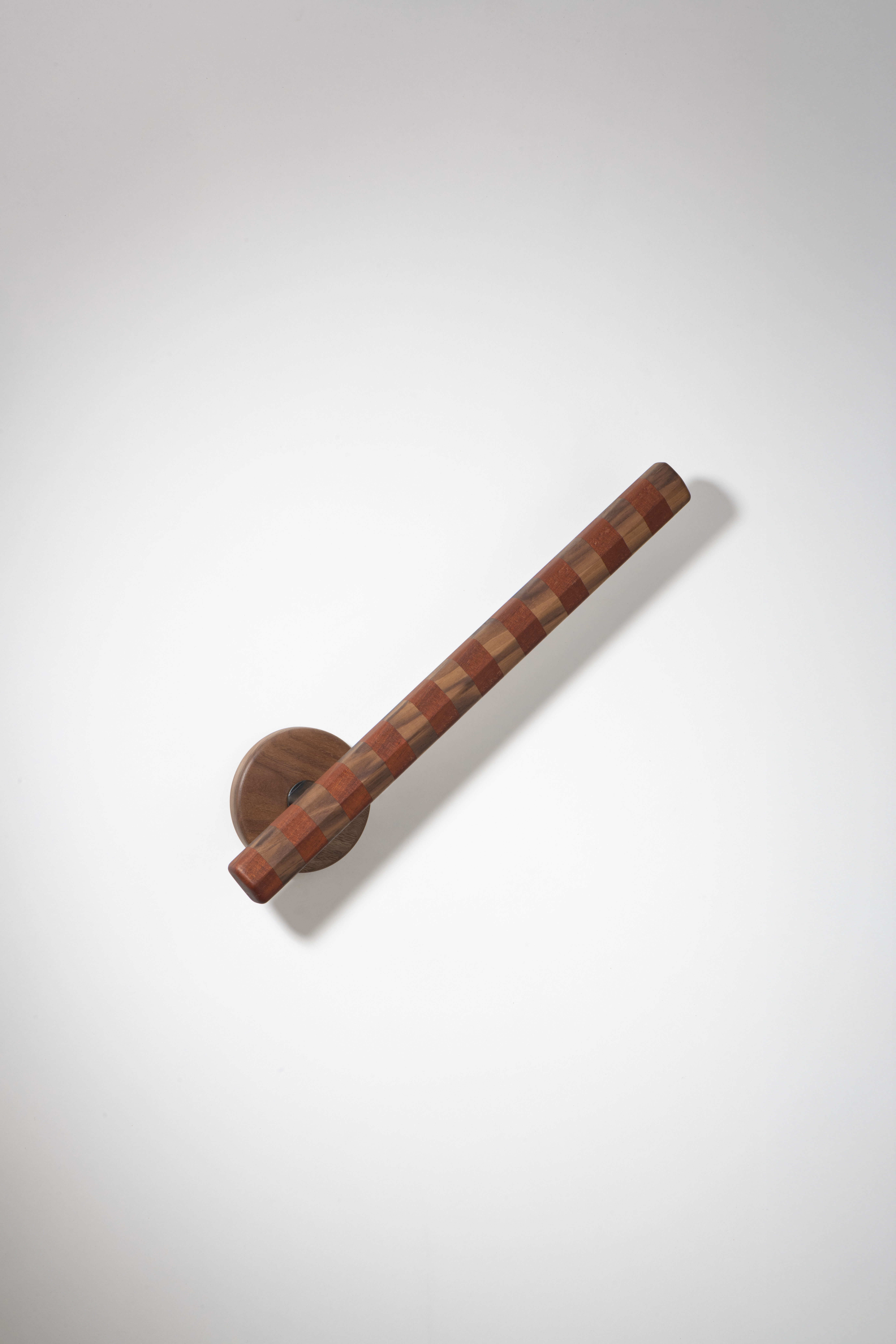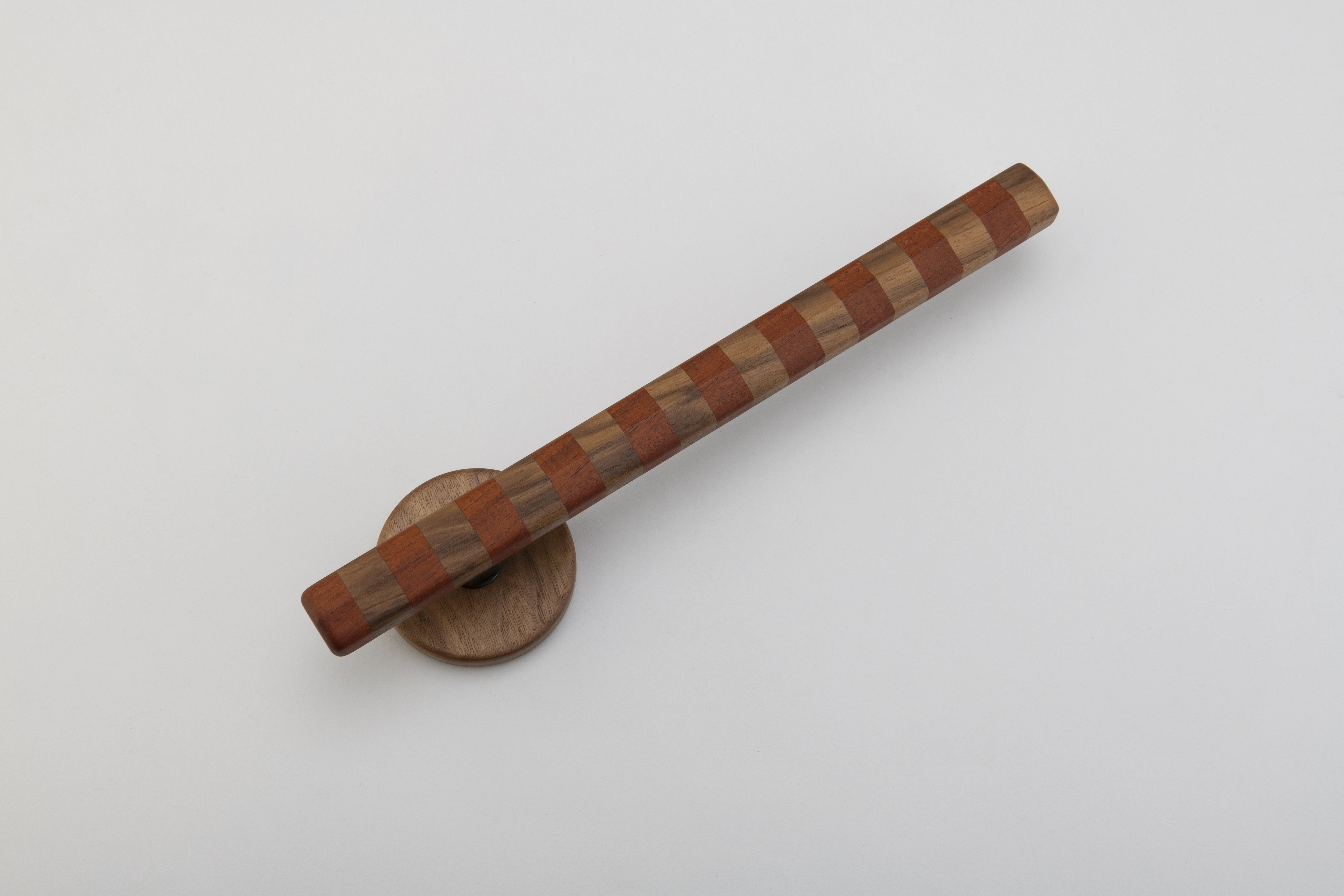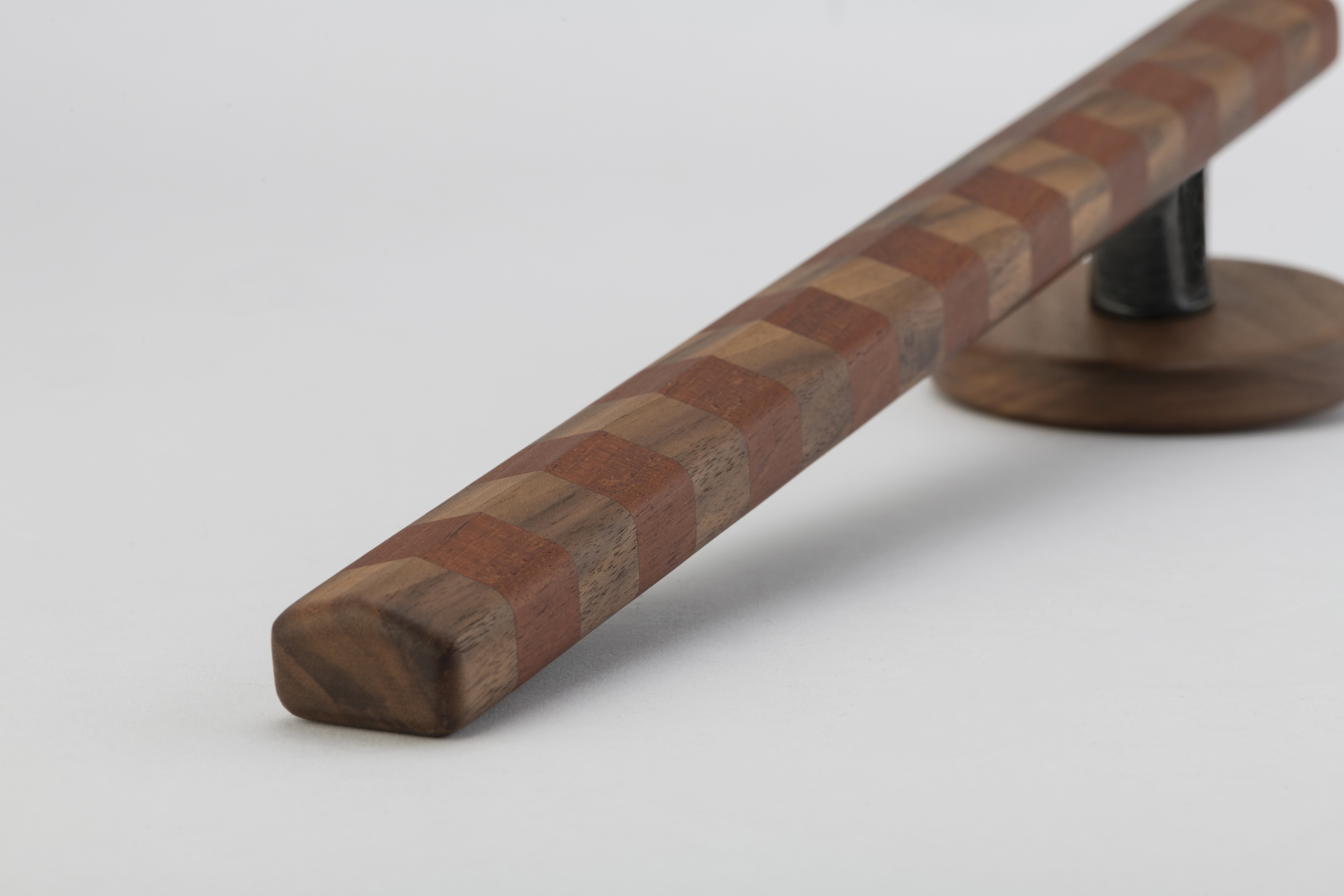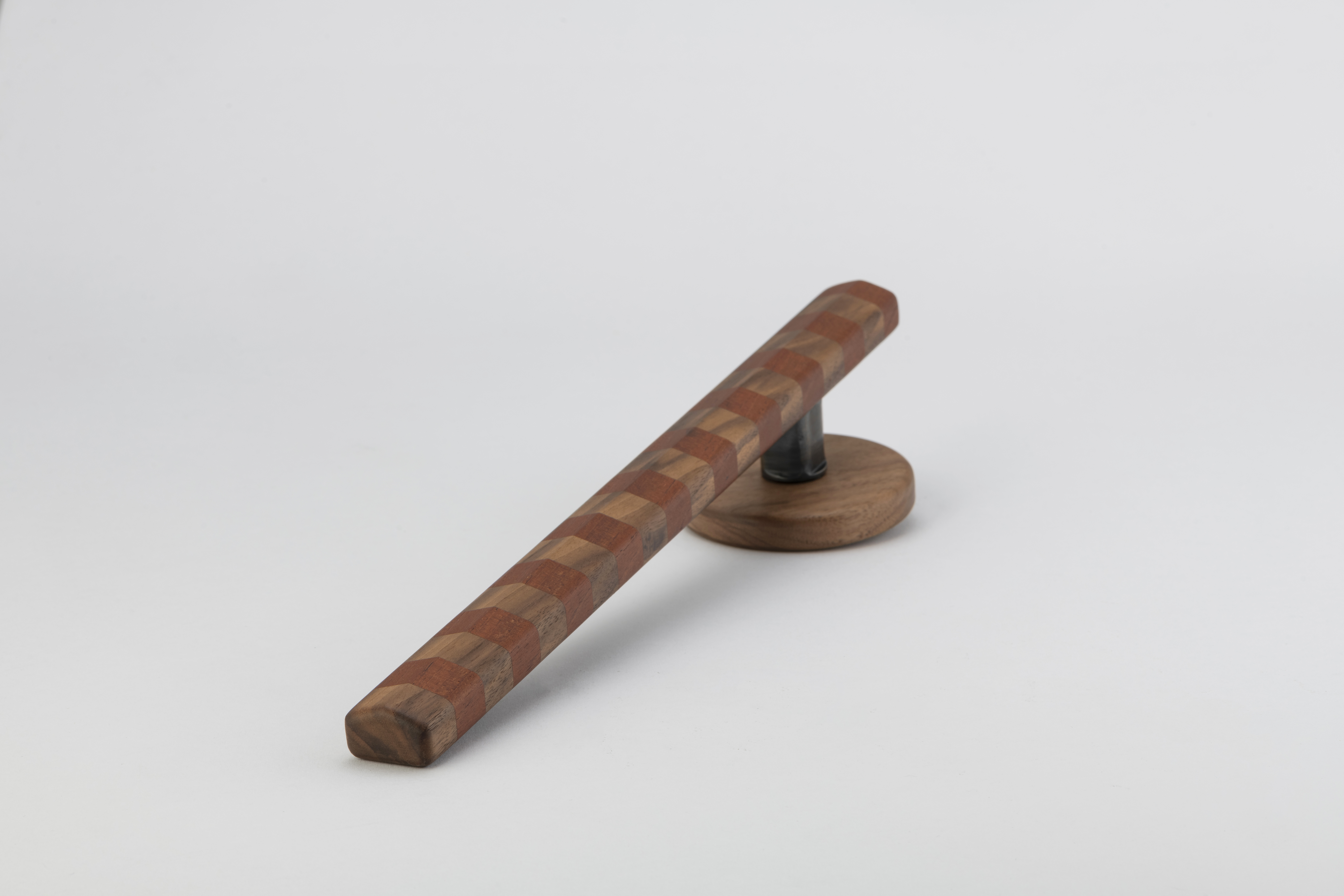 This attention seeking timber lever is named after its off-kilter, tilted design and elongated scale. Creatively, it shifts perceptions of a door’s purpose. Rather than nonchalantly entering and exiting a room, it was designed to make people feel that they were in-between spaces and walking into something special when they draw down upon the lever. The suspenseful sensation can be likened to opening a vault (hence its 45-degree orientation). In its closed position it also provides a more interesting profile than a typical vertical or horizontal handle. Designed for internal use and offered in three different contrasting banded timber colourway combinations (all crafted from solid timber in natural shades found amongst assorted species), its playful ‘easy grab’ nature makes it a standout feature. This product comes with face fix wood screws and tie bolts. All fixings are concealed.