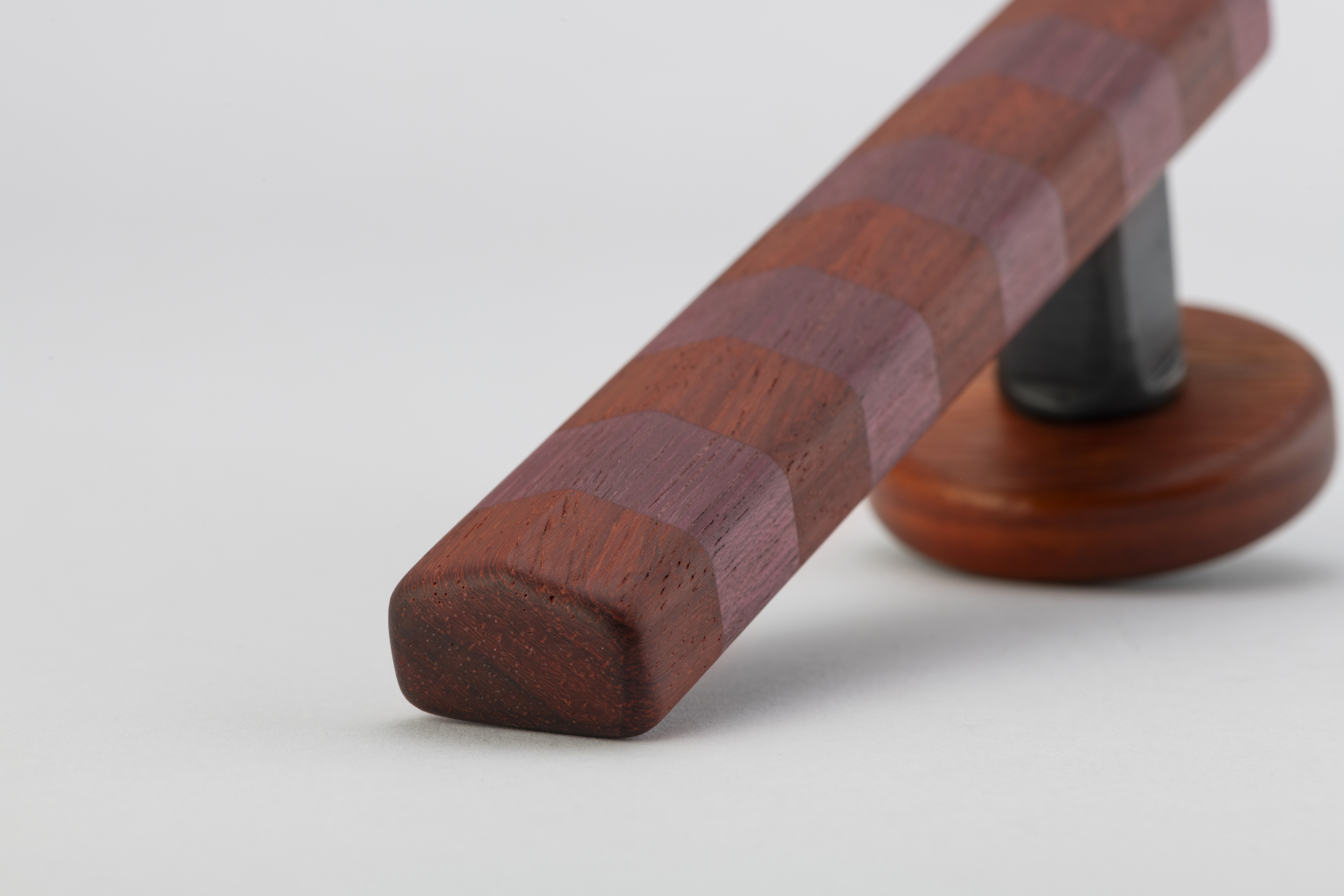Like its name suggests, this universal lever plays on the term ‘straight shooter’ given its easy-to-grab horizontal plane. Superbly crafted from solid timber species that span the globe, it is offered in three different striped colourways. Contrasting natural tones range in intensity from deep brown paired with blonde or an earthy red shade, to more vibrant bands marrying rich aubergine and tangerine for bolder entry statements. Smooth and warm upon contact, its subtle angled profile elevates every door it adorns. Also available in Patinated Bronze, along with a Return version for hospitality and commercial purposes, the bronze touch points will continue to alchemise over time to rich golden shades. Patinated Bronze pieces are suitable for internal and external use. This product is sold as a pair and comes with face fix wood screws and tie bolts. All fixings are concealed.