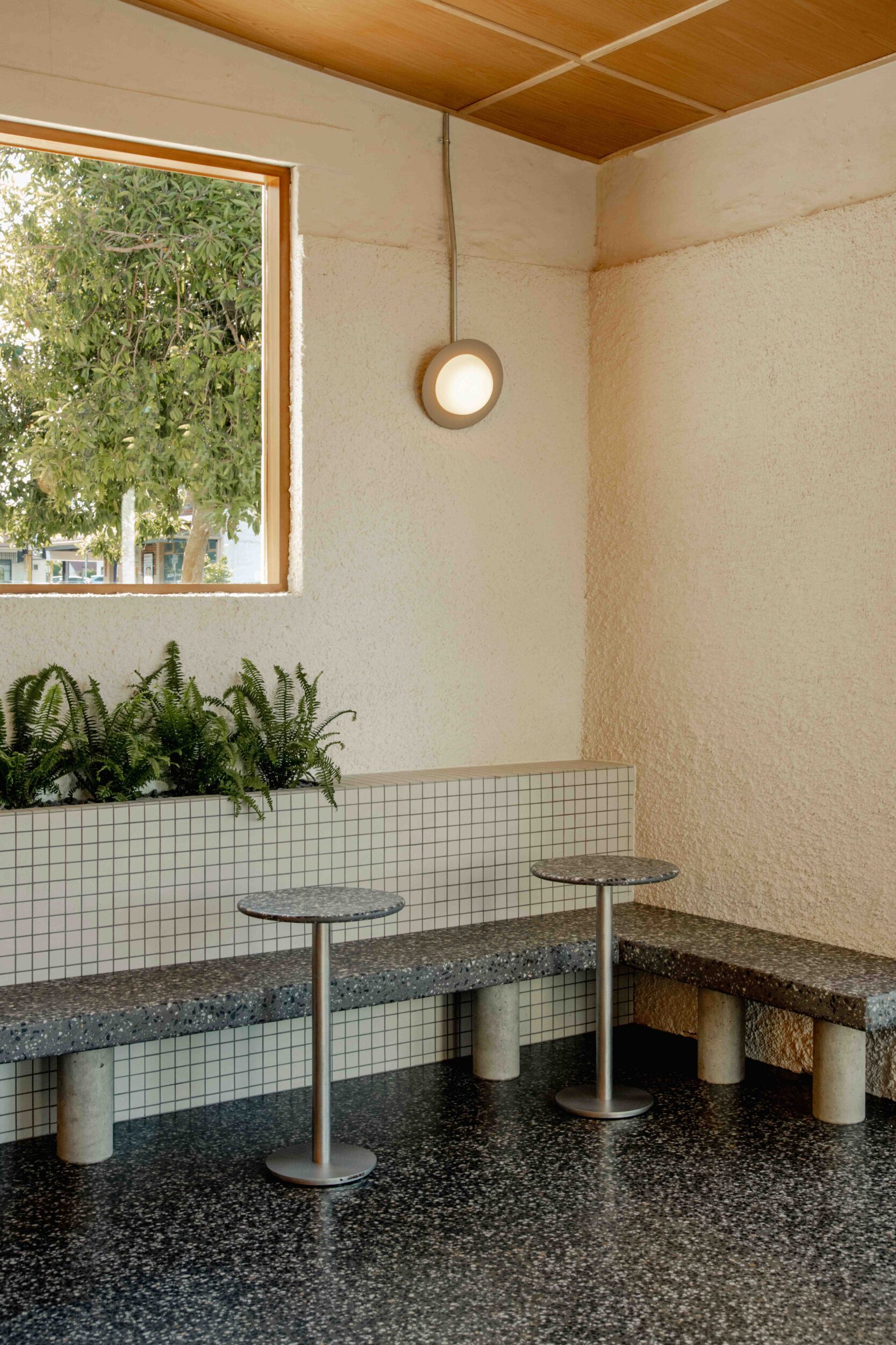 An old workshop on an obtuse corner has been restored and refreshed to create this retro inspired Gelato shop. Utilizing the workshop’s existing openings, strategically placed windows enhance the shop’s design, creating a bright and inviting atmosphere. Retro materials such as timber panelling, terrazzo flooring, and bench seating were carefully chosen to introduce contrast, complemented by textured white walls both inside and out.