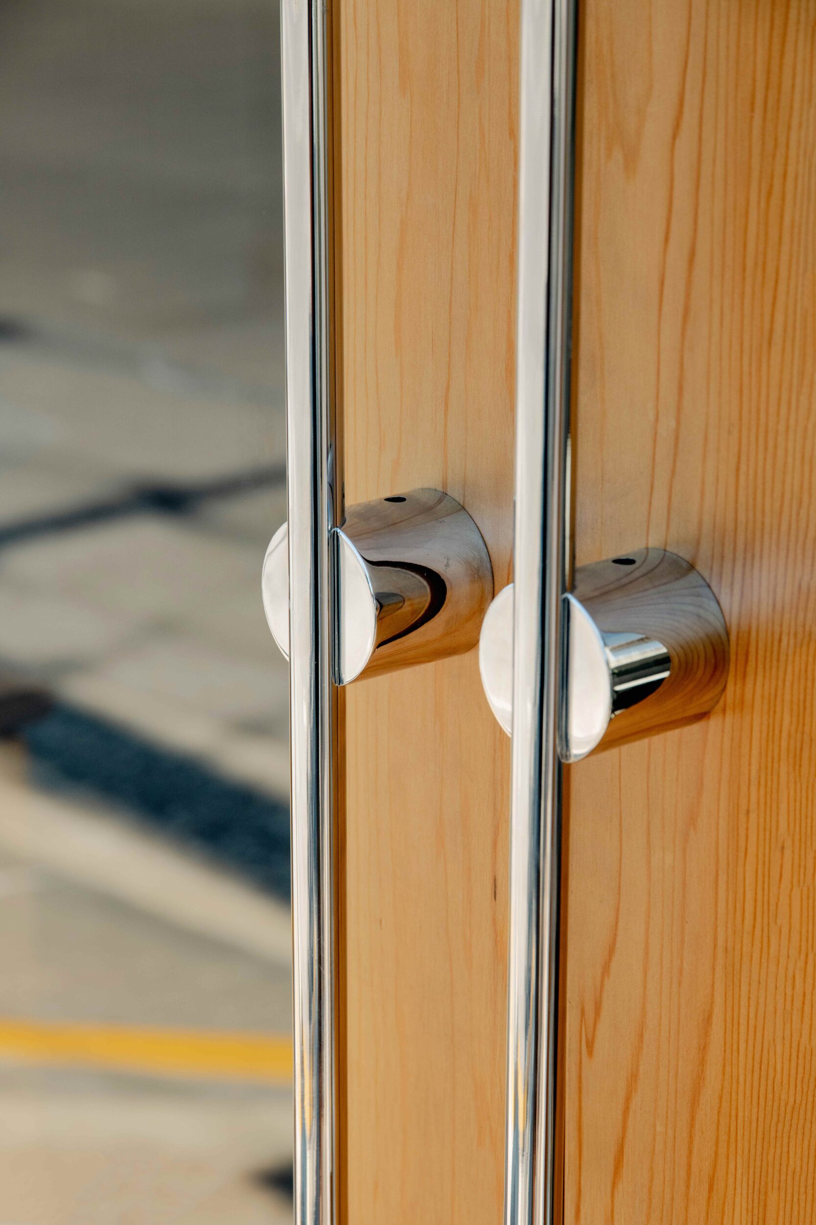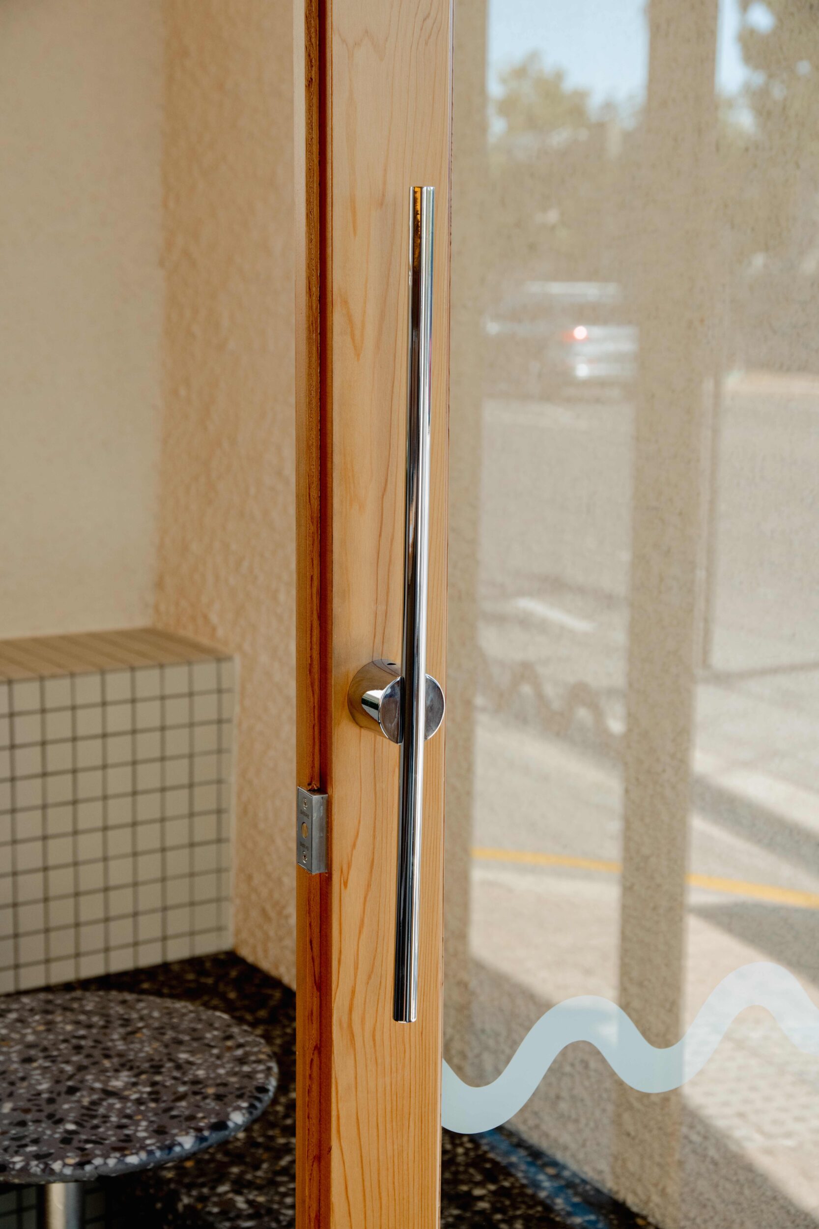 The Messina storefront entrance features the sleek Associati pull in Polished Chrome, from the collaboration with Sans-Arc. The Associati pull, characterized by its minimalist aesthetic, embodies a serious yet imaginative approach, featuring pared-down elements depicted by a line and dot motif. More than just gelato, Messina is an immersive experience in design and taste, and this piece complements the retro design style embraced by the brand.